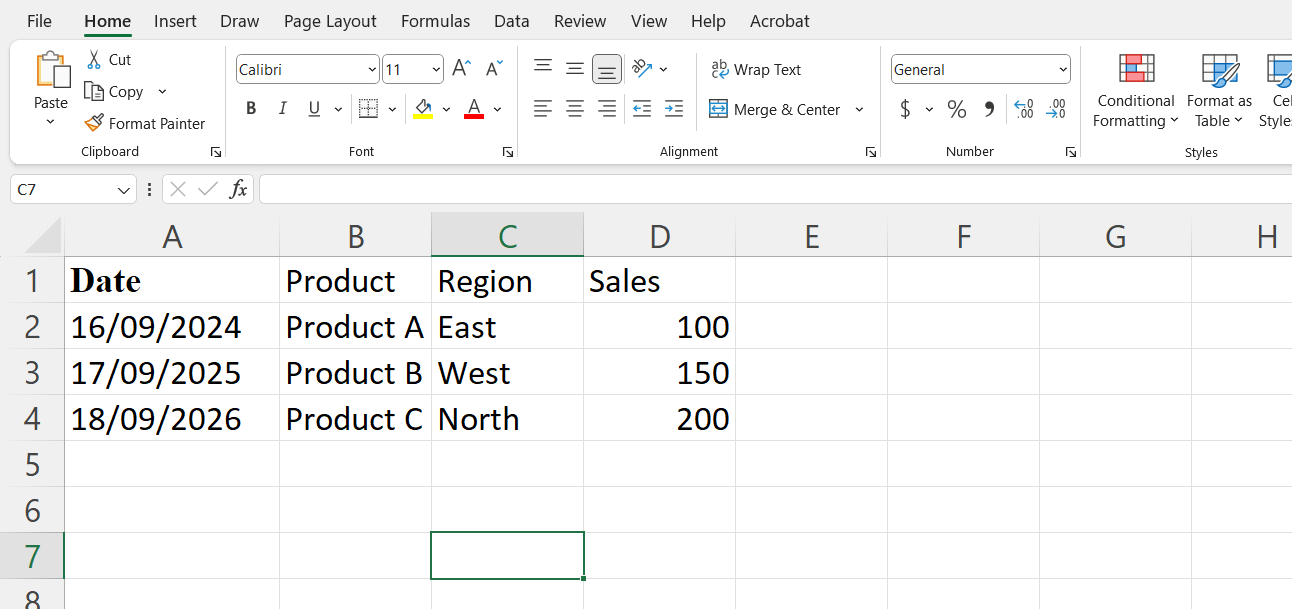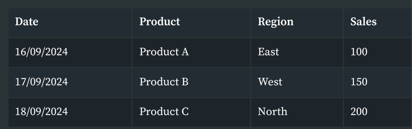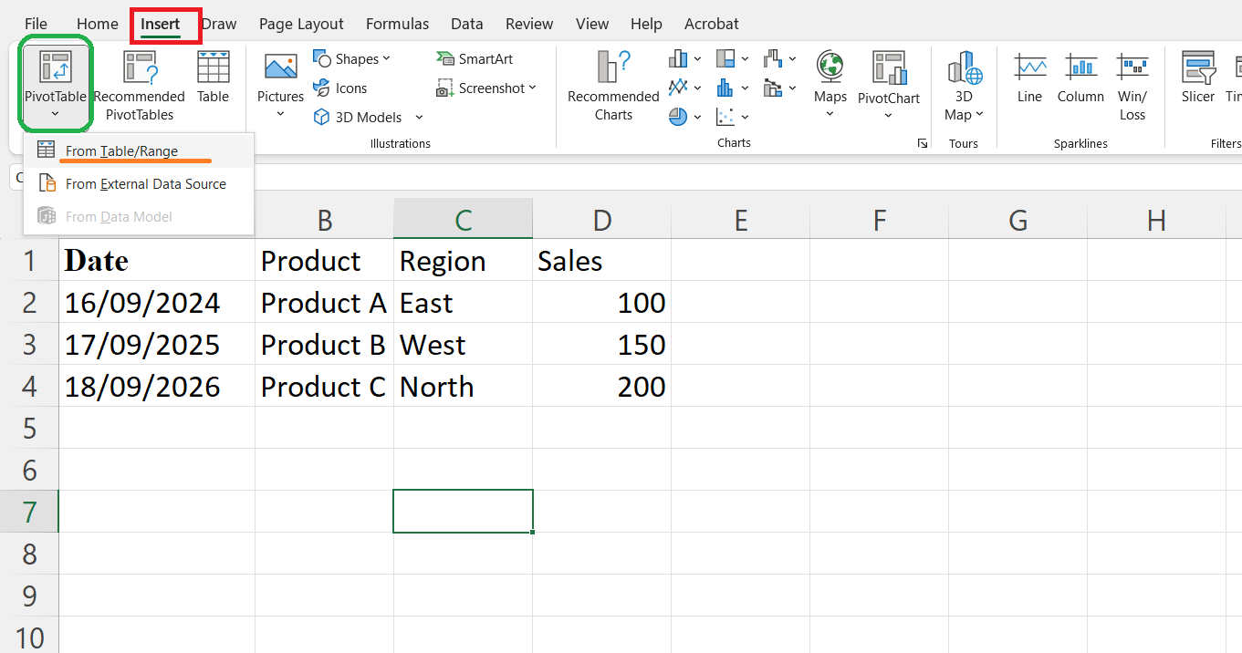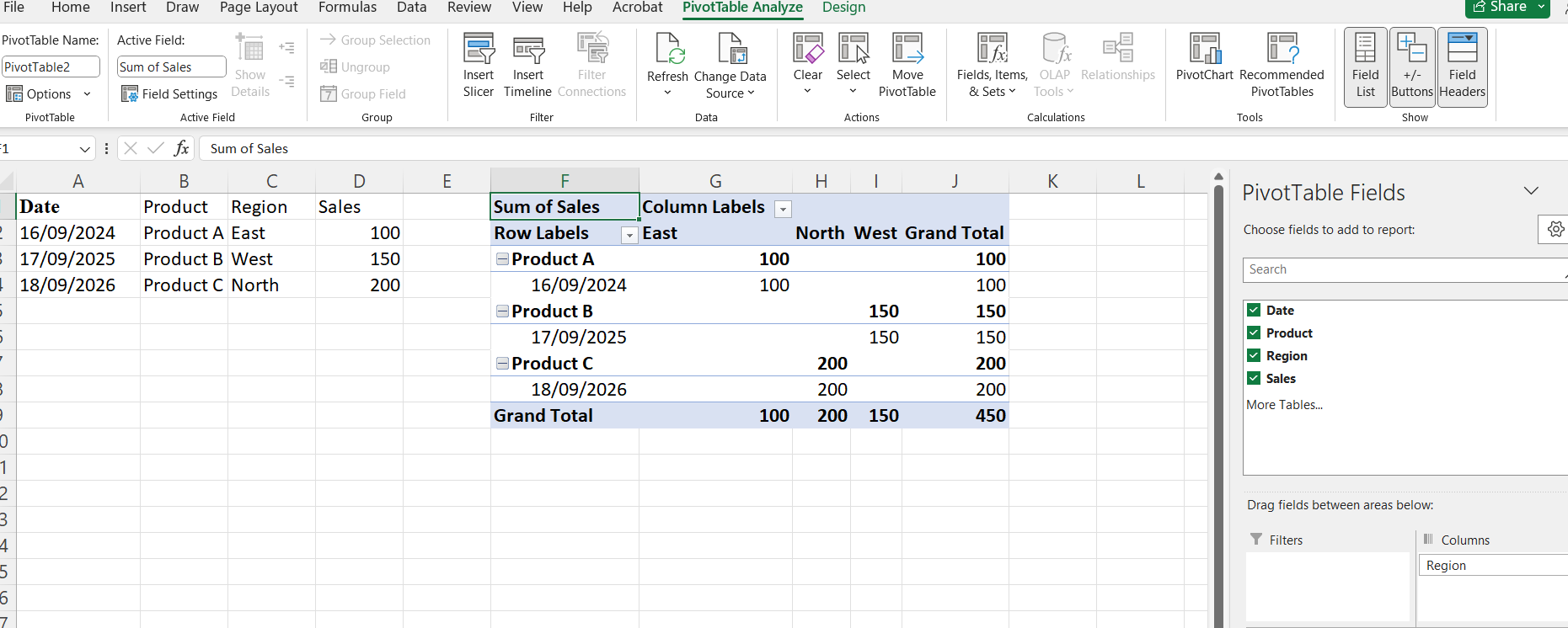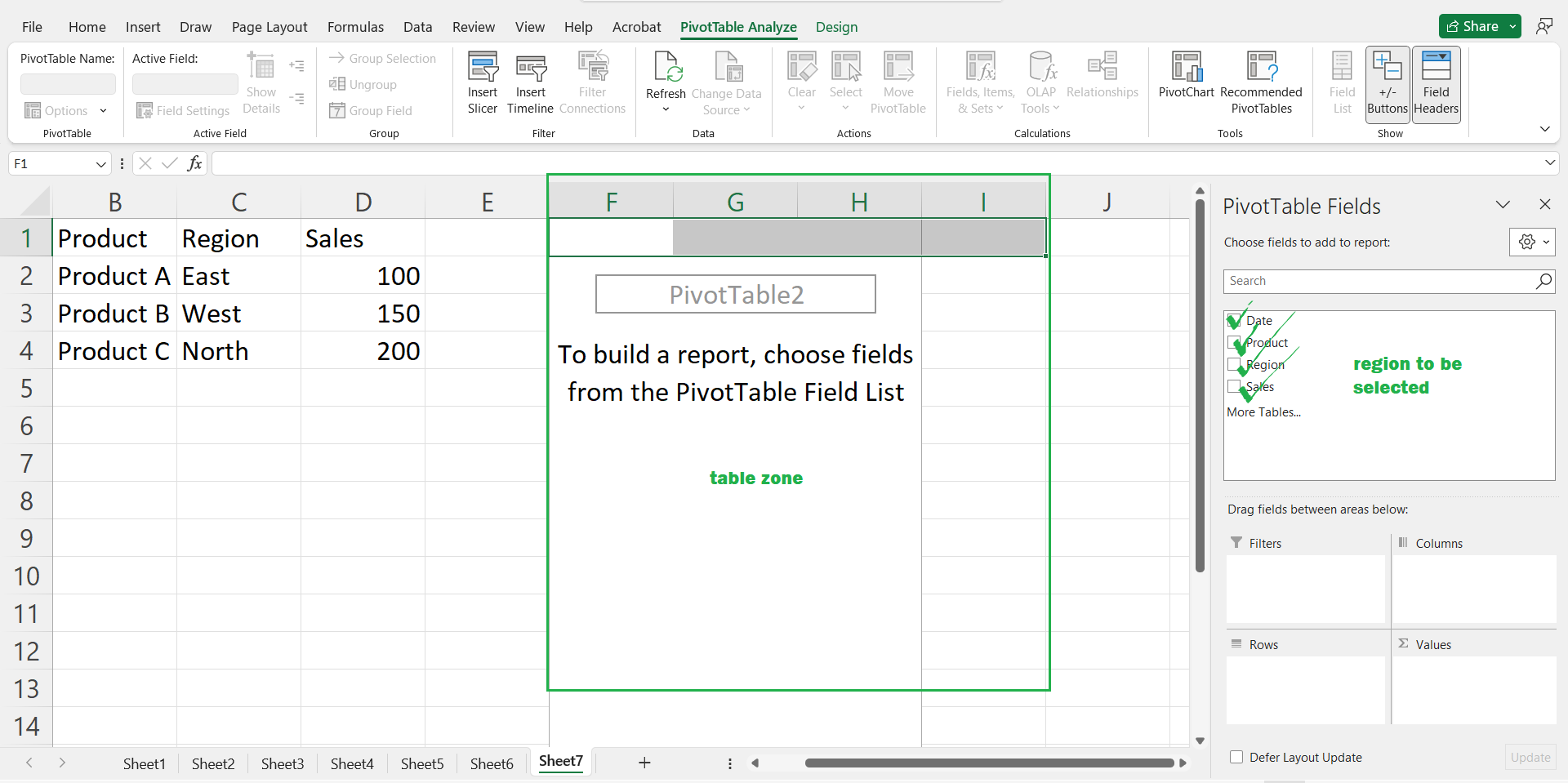 Based on the given data below: Create a pivot table that shows (see) total sales by product, by dragging the product to the Rows areas, Region to the Column area, and Sales to the Values area. Please we want to see the steps taken in adding the pivot table.