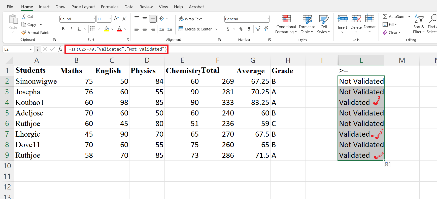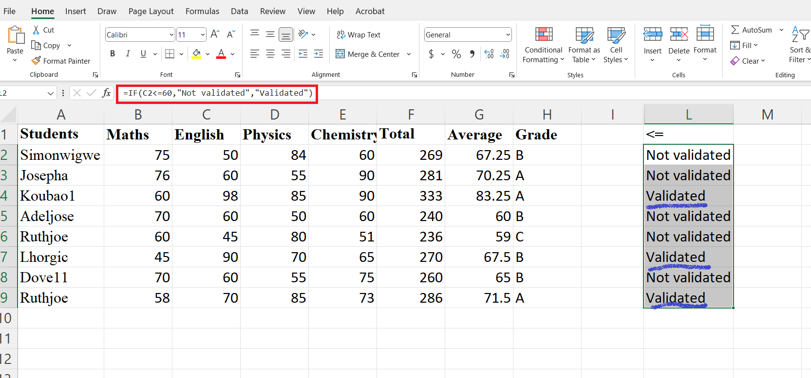 We are going to employ the formula. =IF(C2<=60, "not validated", "validated")
