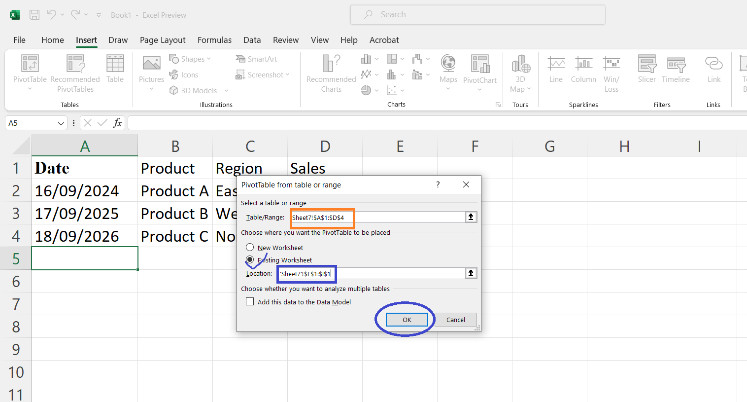 Next, we select the range of our data in the dialogue box, and then it's up to us to put it in the same sheet or on a separate sheet. I will install mine on the same sheet.