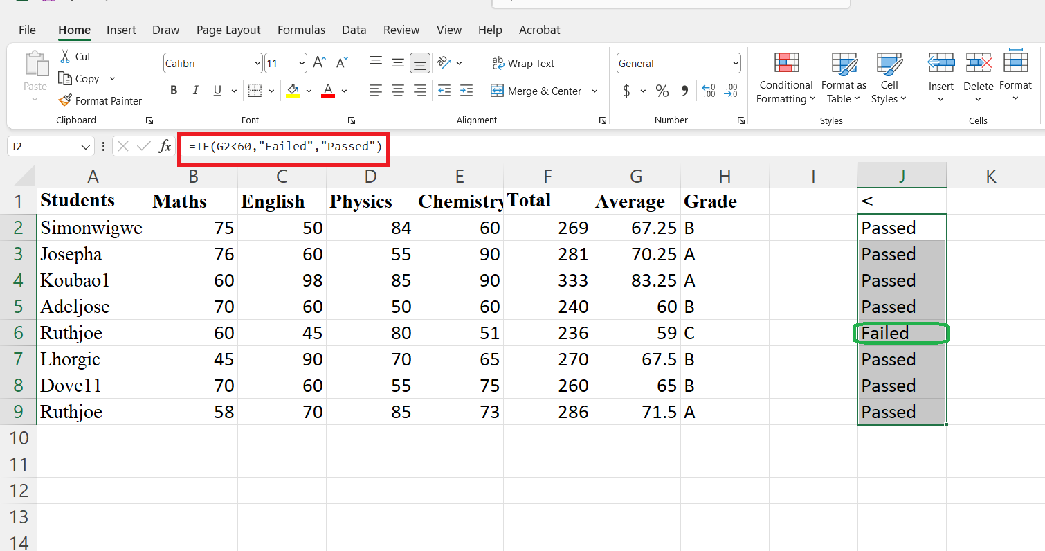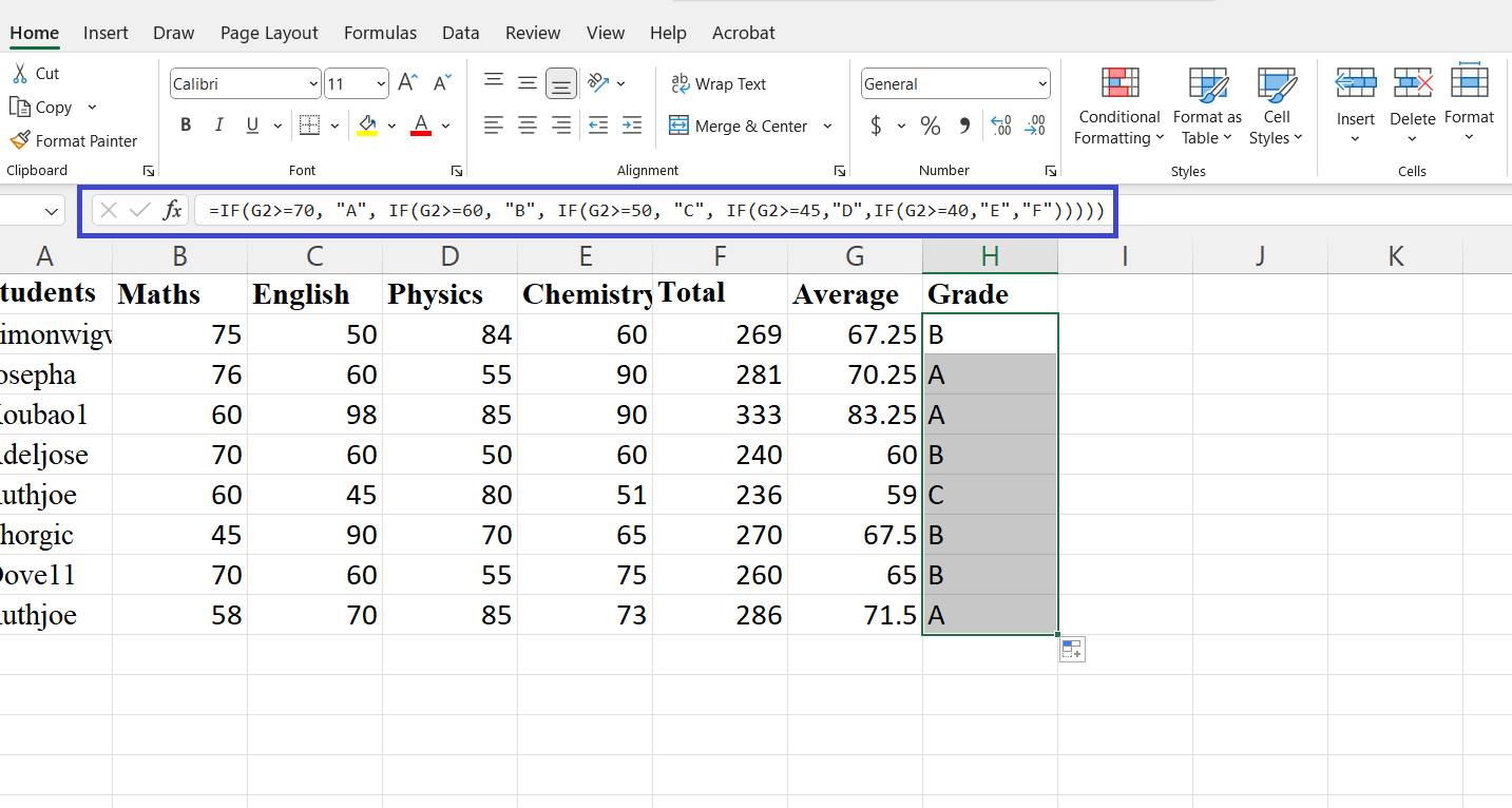 For the grade let get to you the logical function IF. to begin with, we input the formula. =IF(G2>=70, "A", IF(G2>=60, "B", IF(G2>=50, "C", IF(G2>=45, "D", IF(G2>=40, "E", "F")))))