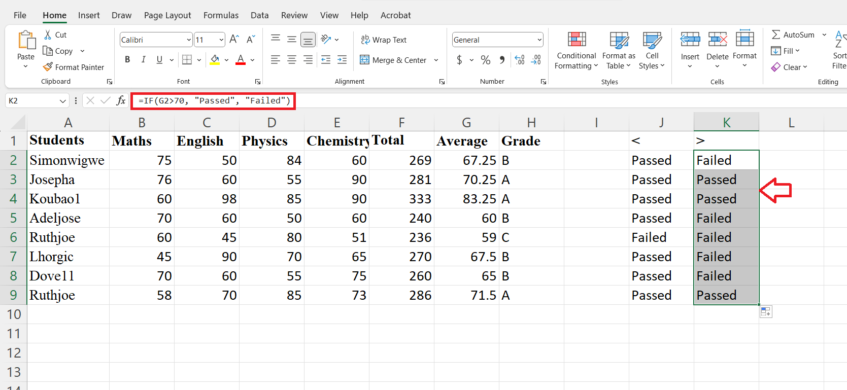 This is used in the same way at the less than function, but the difference is we are going to assign our true value to be a passed and our false value to be a failed. We do this by implementing =IF(G2>70,"PASSED","FAILED")