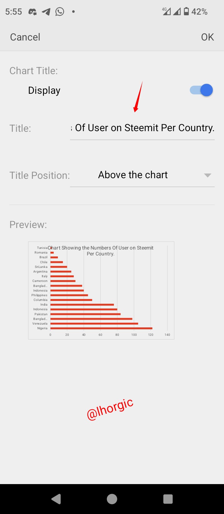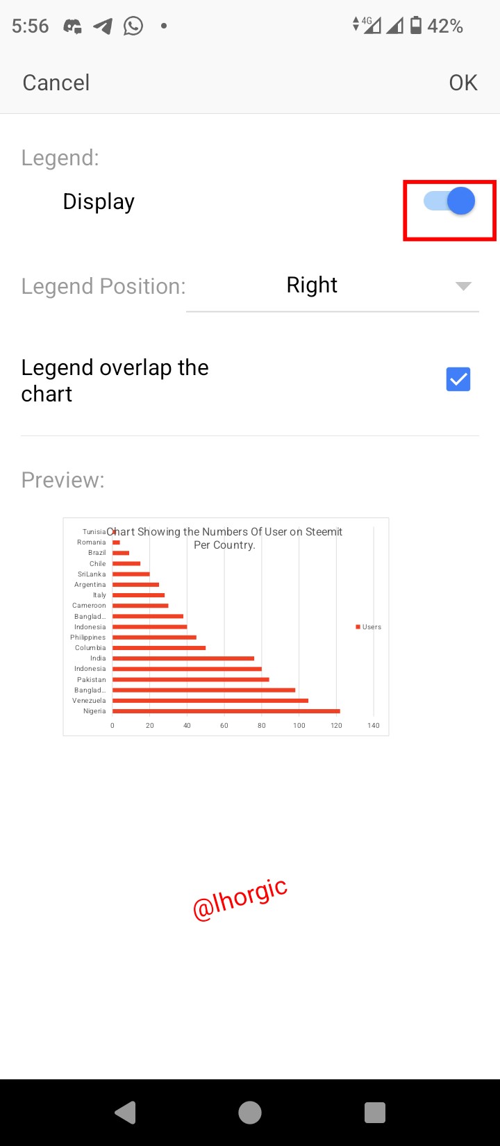 • Step 5: I then put in the title of the chart am preparing just as seen, and then went back to select the legend and then set my parameter, by toggling on the "blue"" bottom and positioning the legend to the right side. The result can be spotted in the images below.