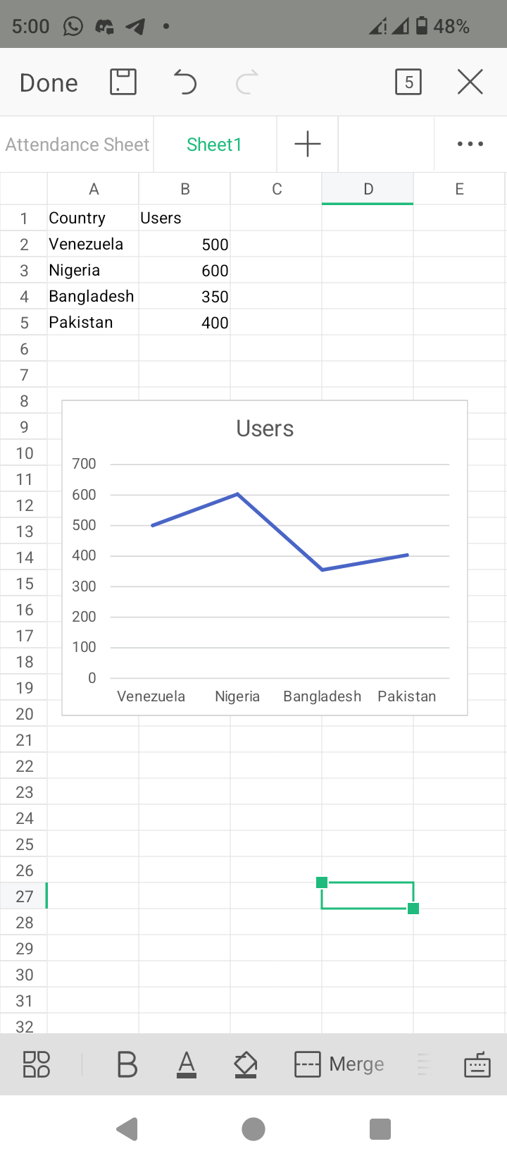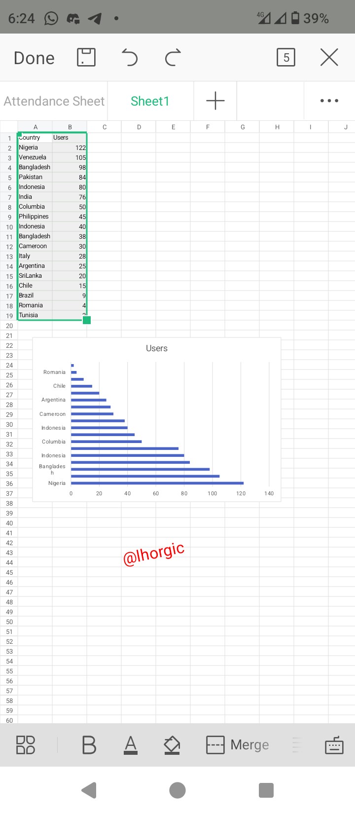In this section, I want to prove that I can read information concerning chart and not only that, I can locate whatever chart I want to use for my data. For this task we have been asked to use Bar Chart for this task. I started by entering our data in the spreadsheet using the value given by our teacher. The screenshot is as seen below.