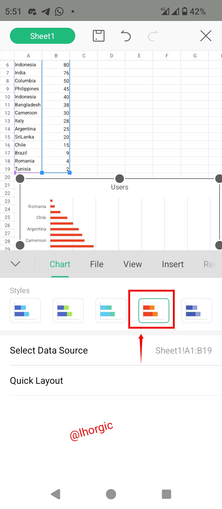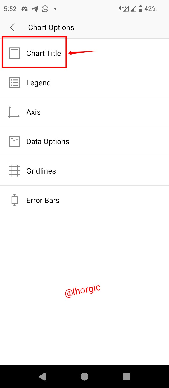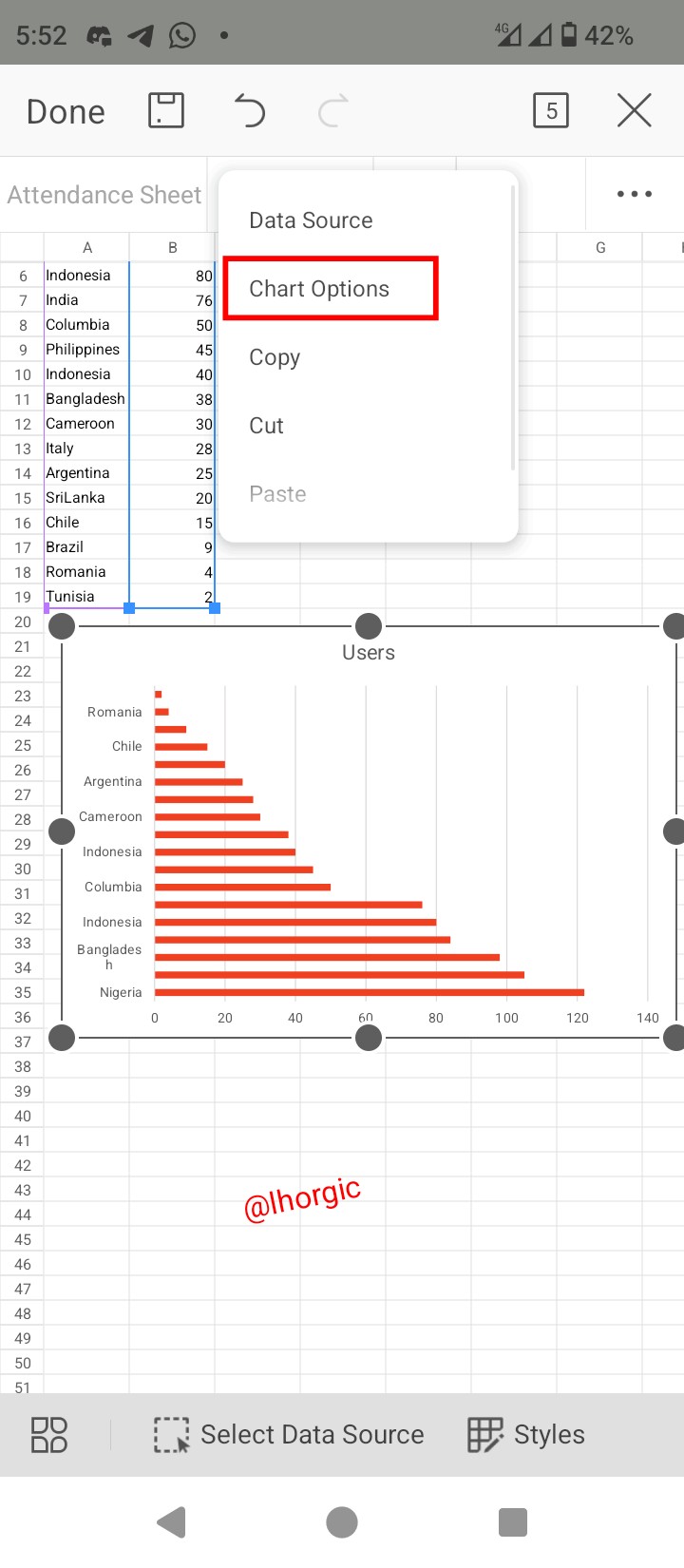 • Step 4: I highlighted the chart and then click on style to change it colour. Upon highlighting the chart again I chose the "chart Option"from the options given and this led me to the title and legend option among others. So I started with title.