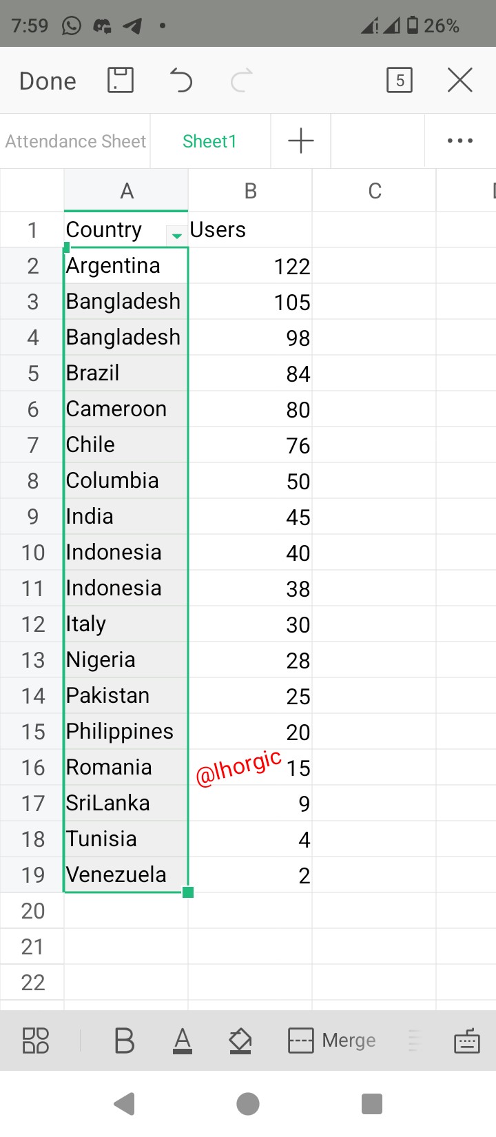 • Step 1: I brought back our data, the one we used for the previous task and then highlighted the country section before proceeding to the menu button once again.