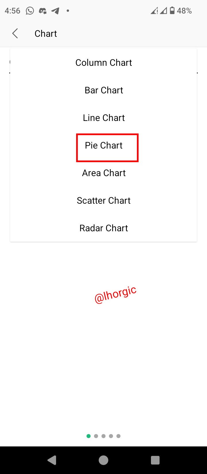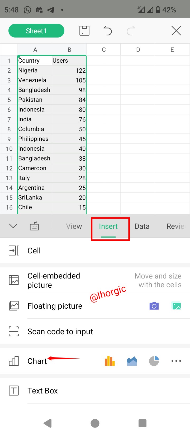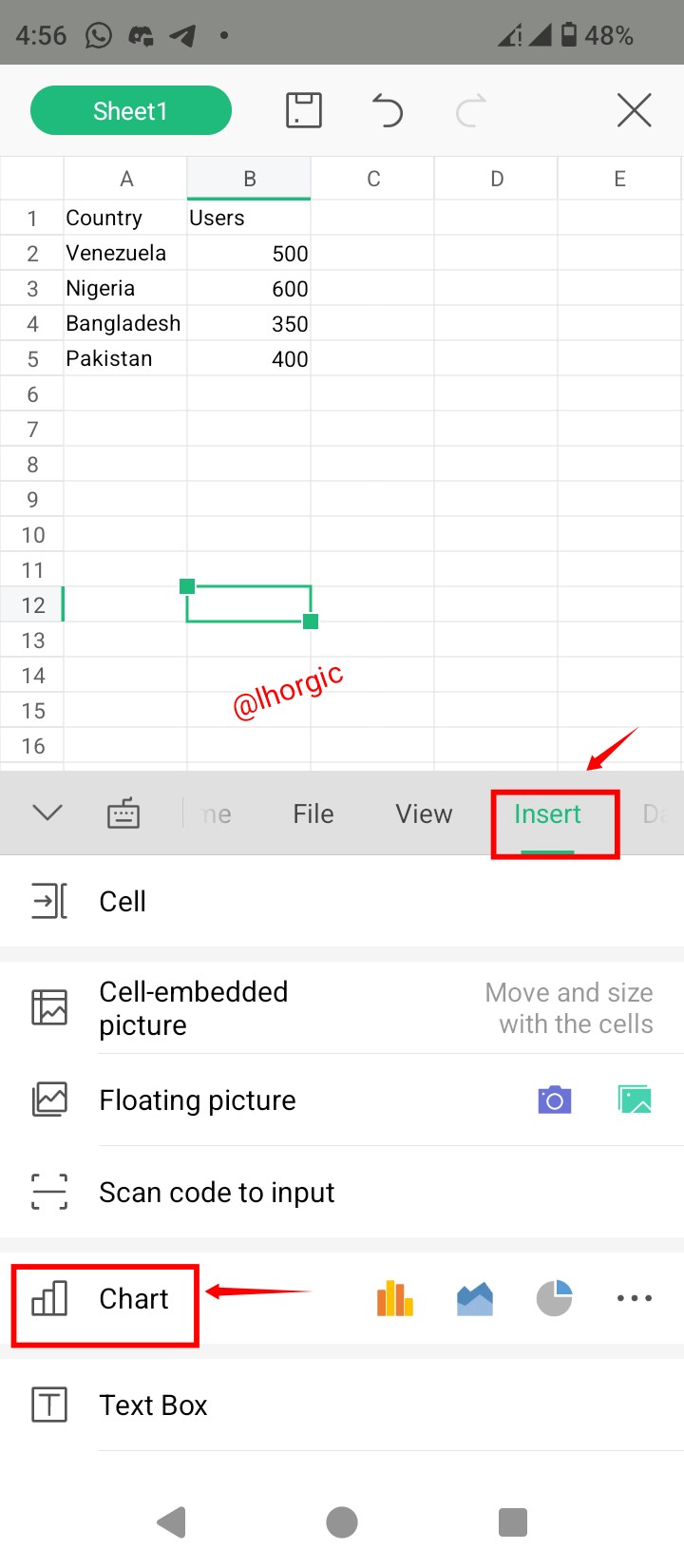 • Step 1: I located the menu button from which I got the insert button and then Chart.