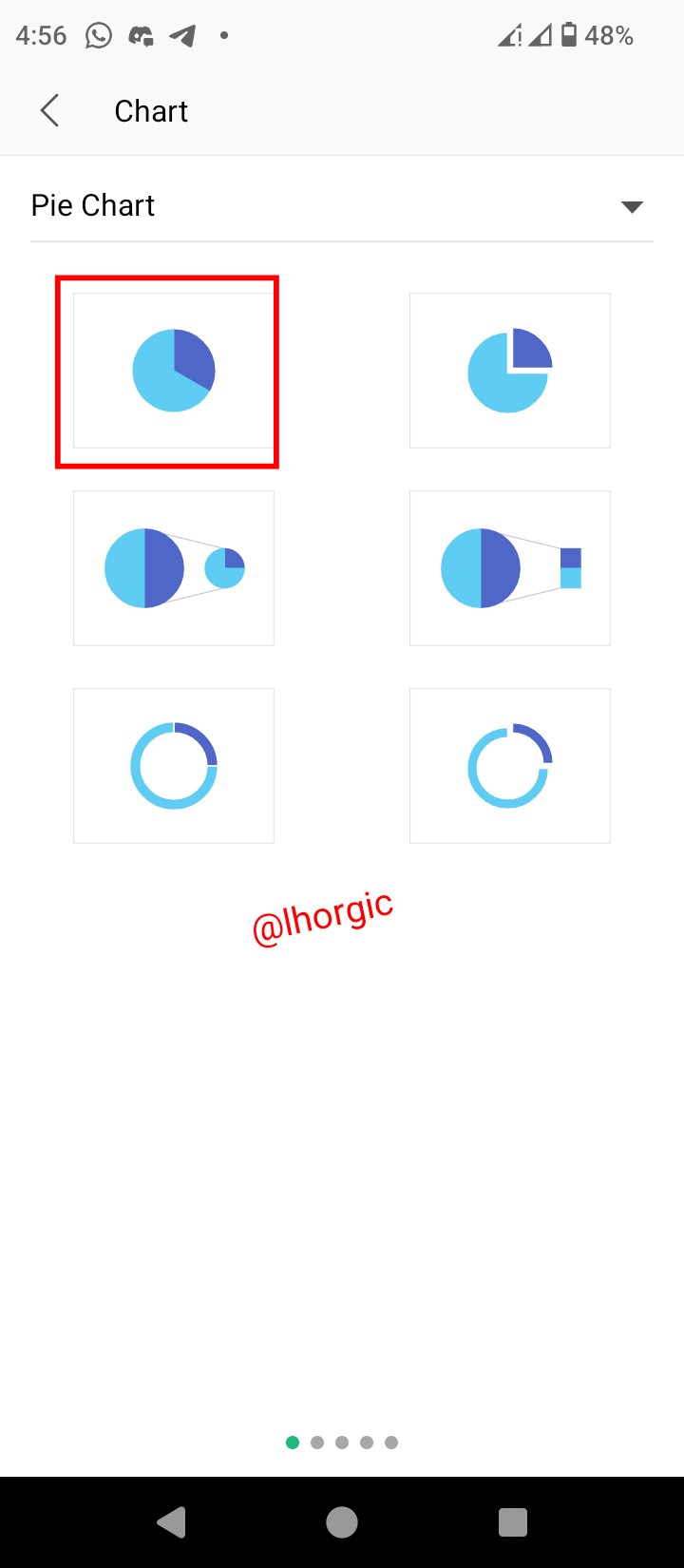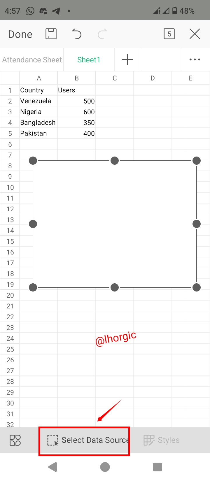 • Step 2: After selecting Pie Chart, I had to choose from the different types and then proceeded with ok. Afterwards, an interface appeared where I click on "select data source" and then highlighted my data. I clicked done and all was set for pie chart.