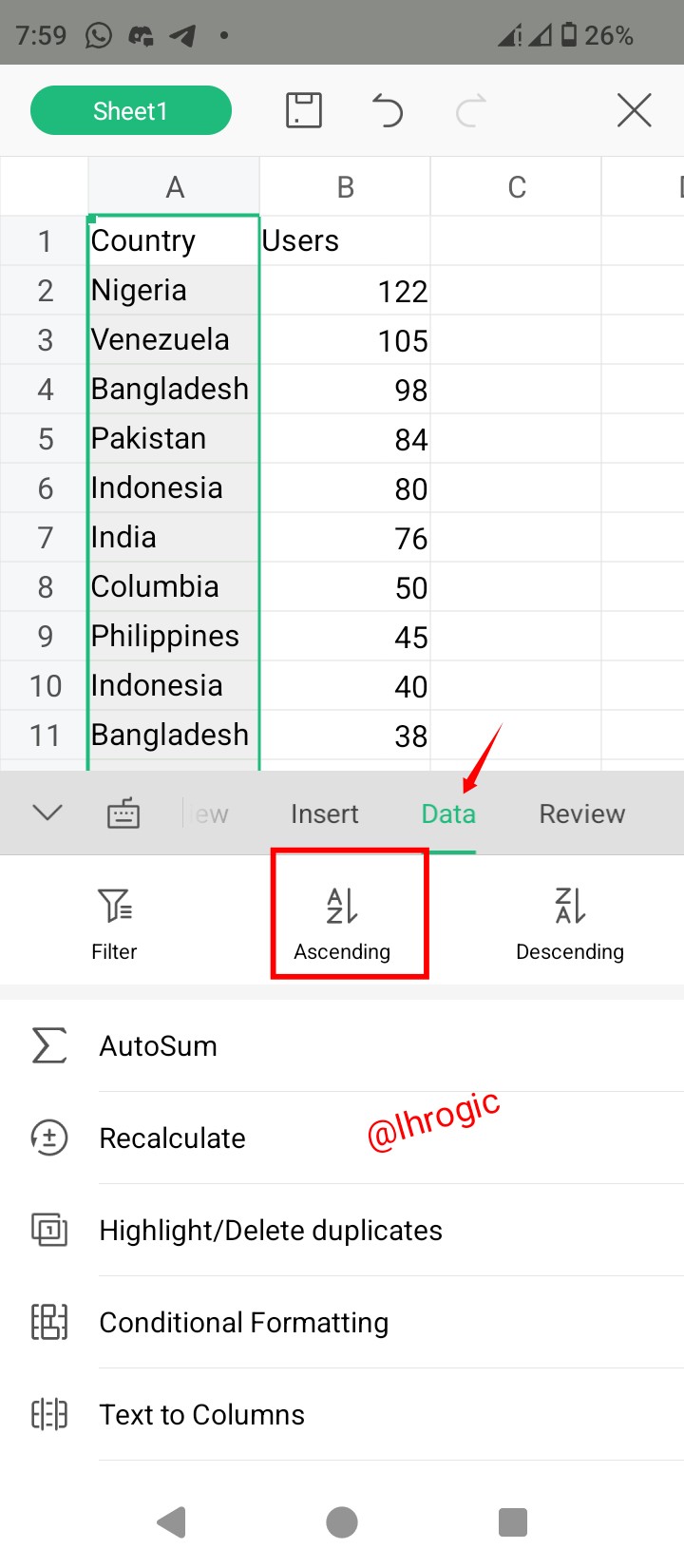 • Step 2: On clicking it, I went straight to my the *Data button, i clicked it and there i found the "ascending" option which is needed for the alphabetical arrangement of the countries we have in the data we are working on