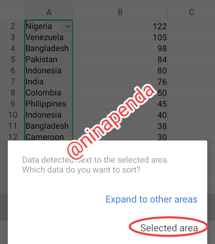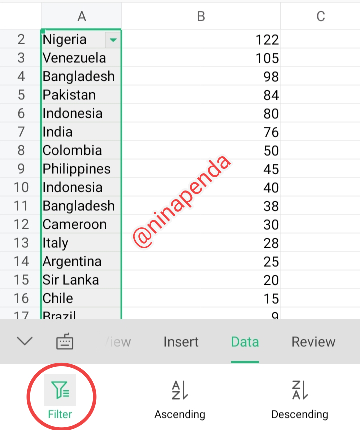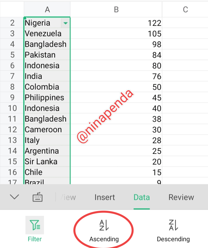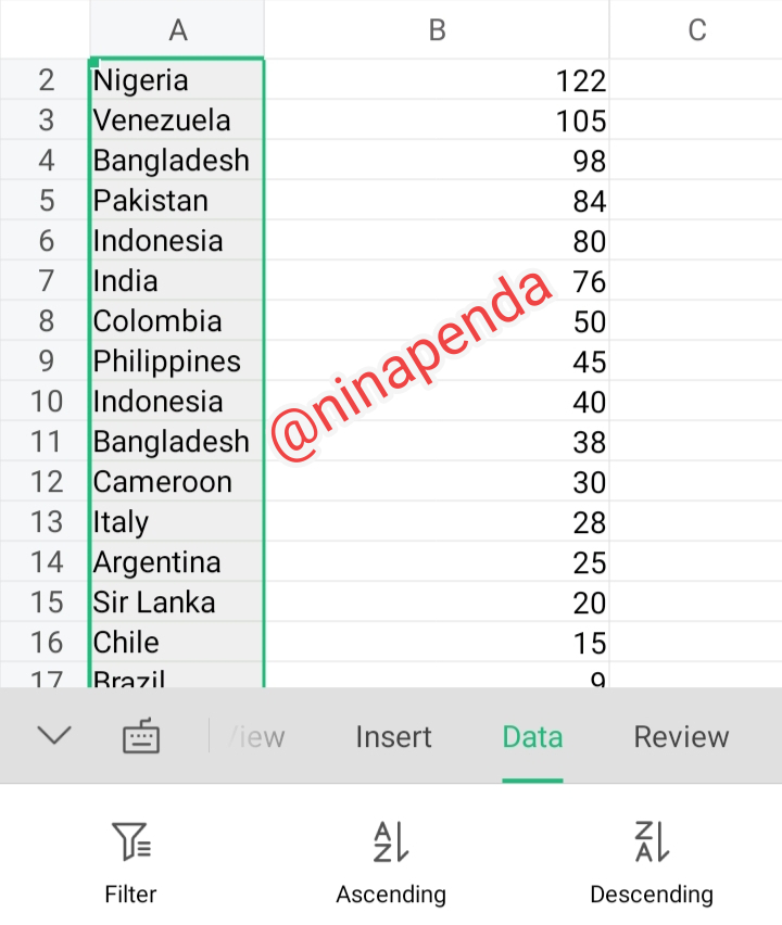 Using the data given in question 2, arrange the names of countries alphabetically using data sorting techniques. Screenshots are needed |