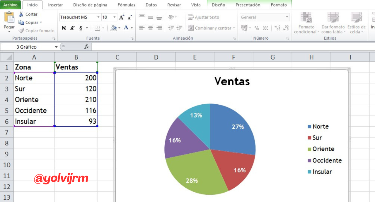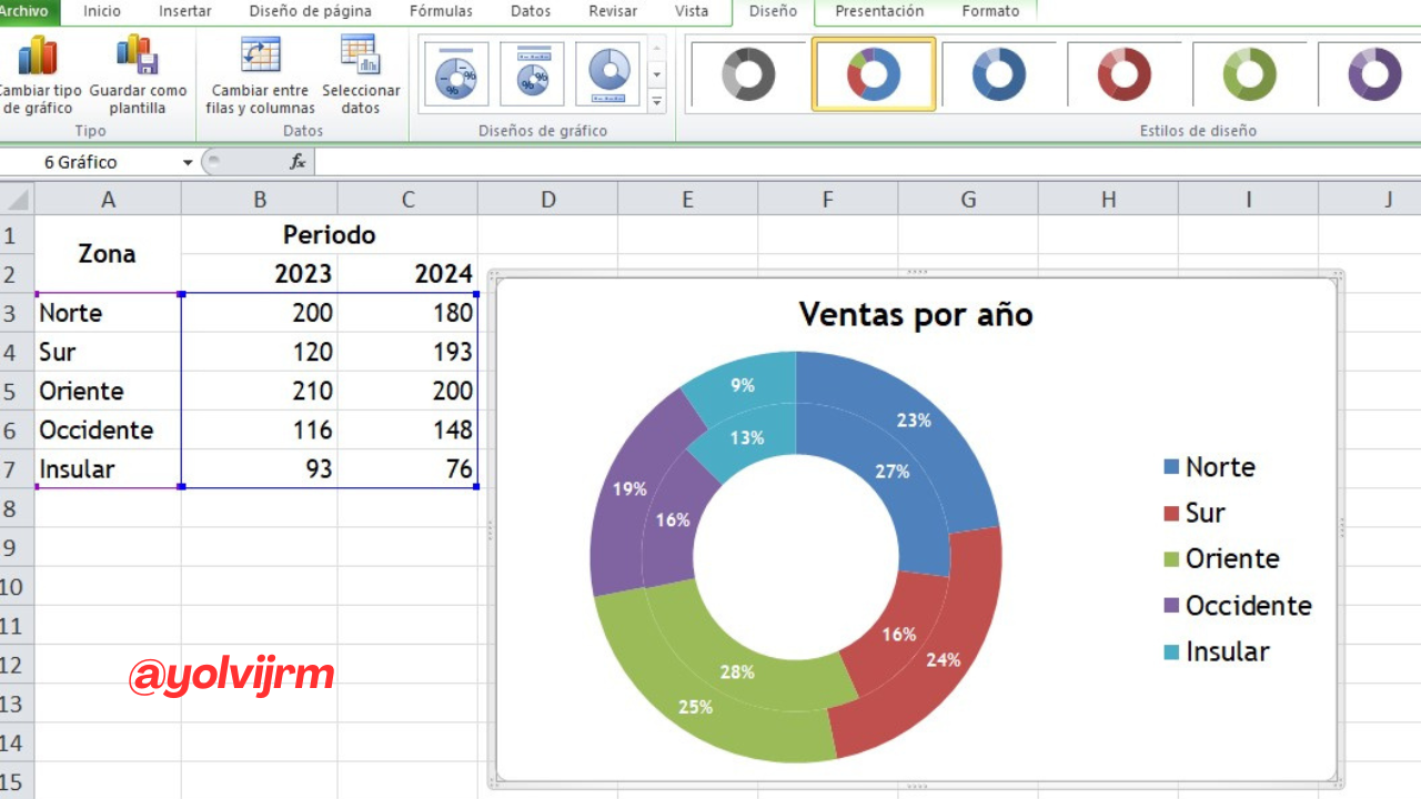 En este ejemplo se puede ver las ventas por zonas para dos años, donde se destaca que para el año 2023 la zona con mayores niveles de ventas era Oriente con 28%, pero para el año 2024, pasó a estar en segundo lugar ya que presentó el 25%, por debajo de la zona Sur, que pasó a liderar las ventas con un 24% del total.