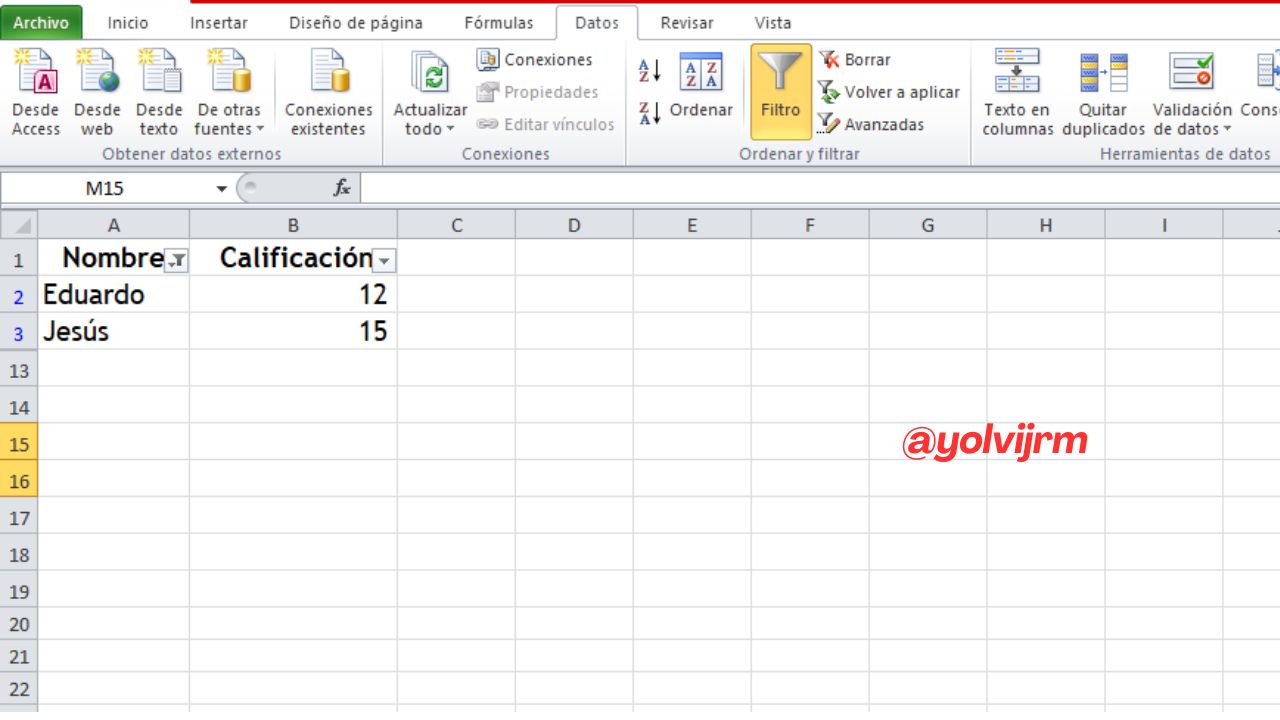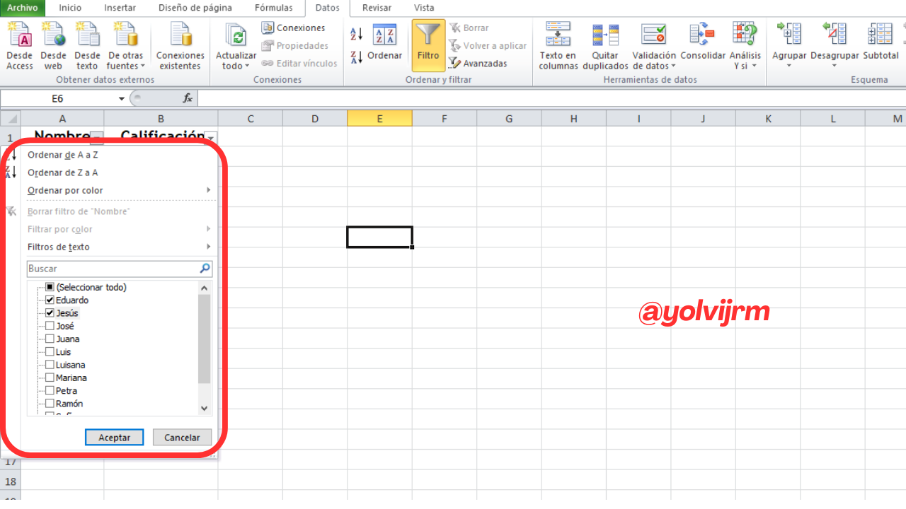 Una vez se despliefgue la lista de ocpiones de filtrado, se debe seleccionar la condición a aplicar; en este caso se tildó para obtener solo los datos de Eduardo y Jesús. Luego que se acepte la lista filtrará y mostrará solo lo solicitado.