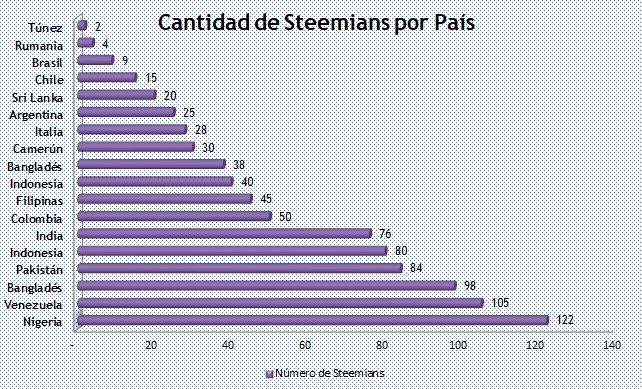 Es así como a partir de este gráfico se puede decir que el país con menor cantidad de usuarios de Steemit es Túnez, seguido de Rumania y Brasil; mientras que las nacionalidades con mayor número de steemians son los nigerianos y venezolanos con 122 y 105 usuarios respectivamente.