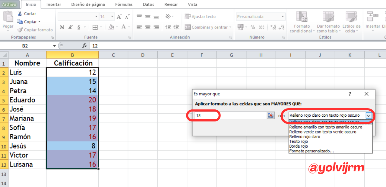 Una vez seleccionamos la función a utilizar, en este caso mayor que, se despliega una ventana en dodne se deben especificar la condició; en este caso se escogieron las calificaciones mayores de 15, y se escogió un sombreado rojo claro, con el texto rojo oscuro.
