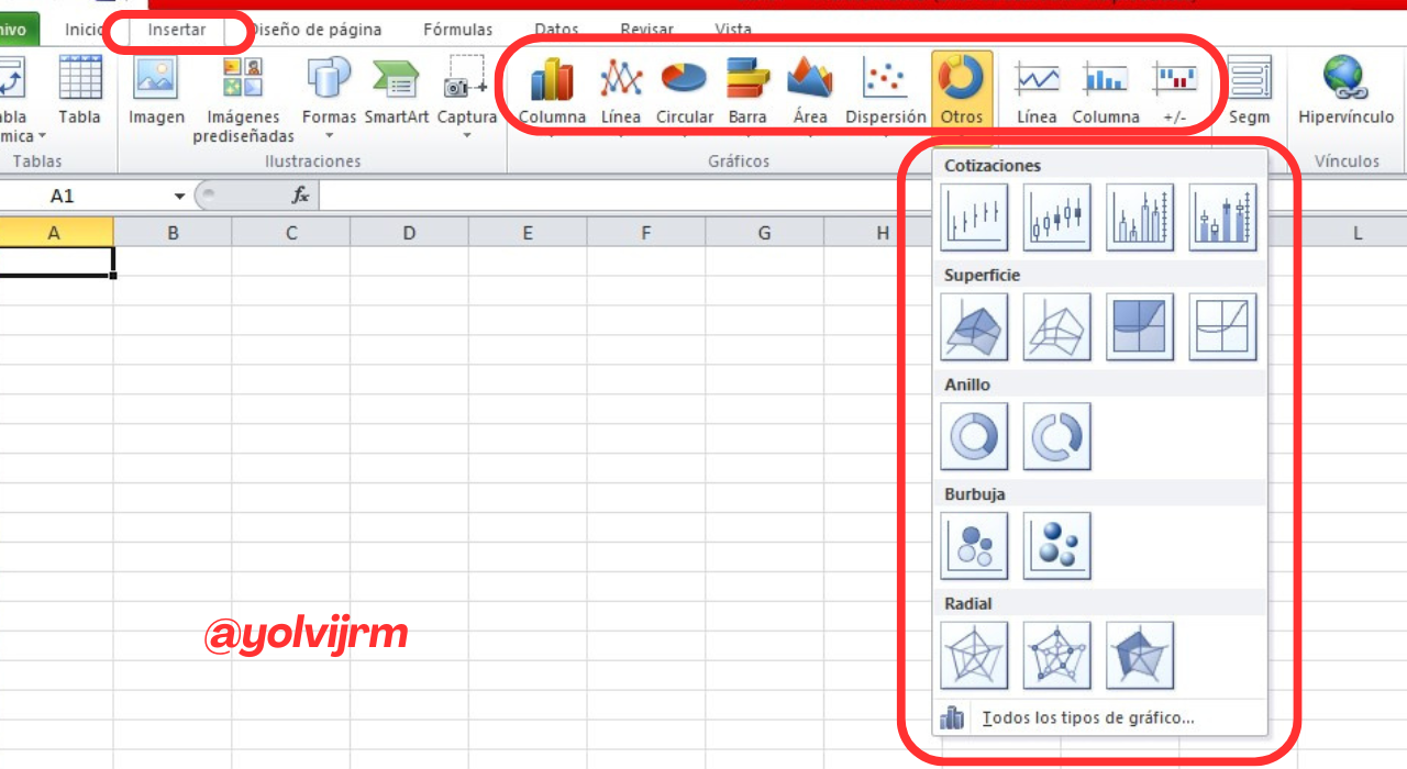 Para hacer uno de cualquiera de estos gráficos, luego de abiri Excel, se ubica en la parte superior la pestaña de Insertar. Seguidamente se nos mostrará los tipos de gráficos que son mas comunes de utilizar, al desplegar la lista de Otros, tendremos los demás tipos de gráficos que hay disponibles.