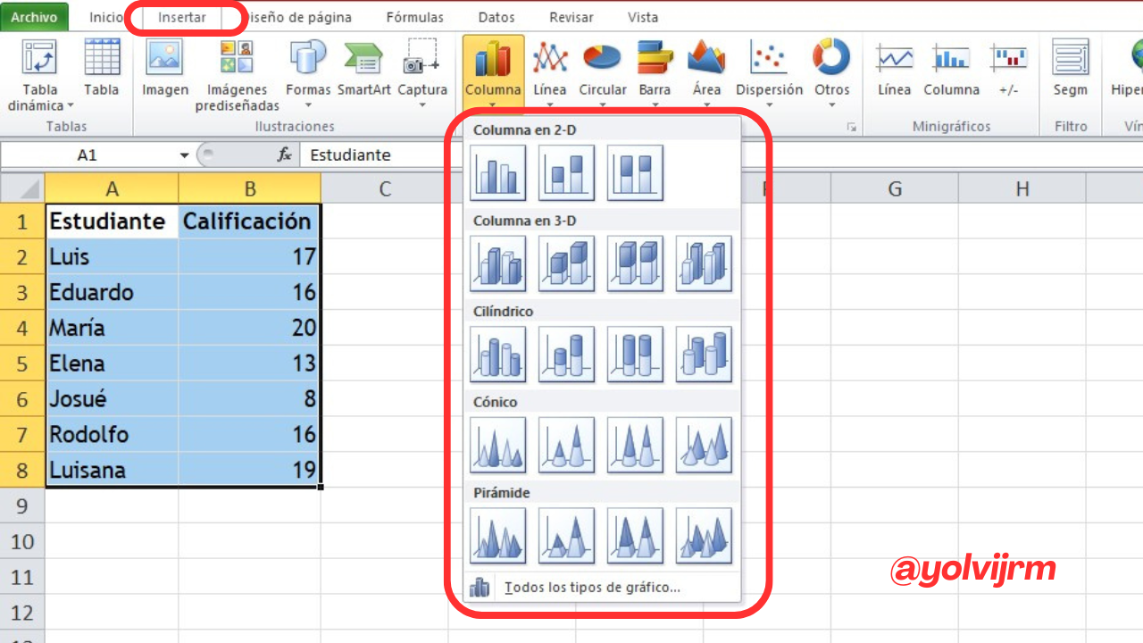 Para hacer uso de este tipo de gráfico en Excel, luego de tener los datos que se quieren representar. Seleccionamos dichos datos, y luego la barra superior sección "Insertar", para seguidamente hacer click en la opción Gráfico Columnas y se nos desplegará todas las opciones que tenemos en esta categoría, y es que tenemos disponible varias formas de representar los datos.