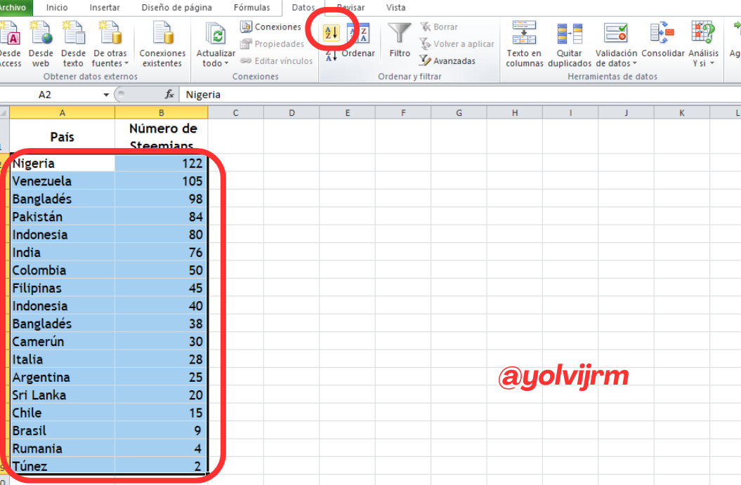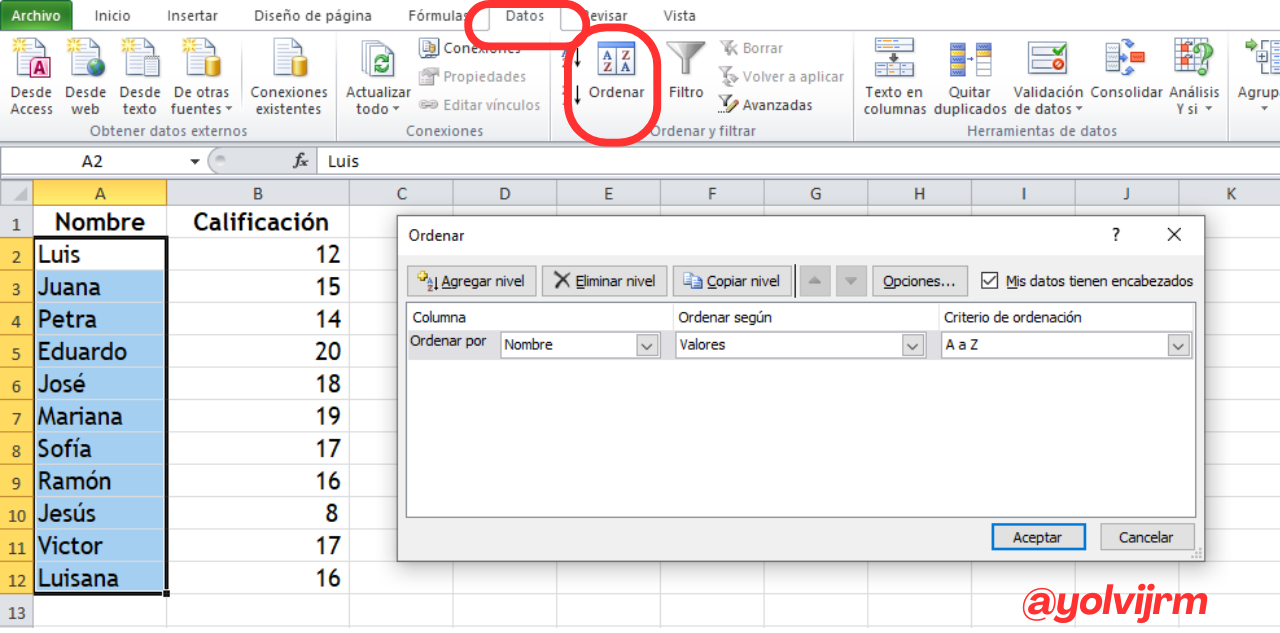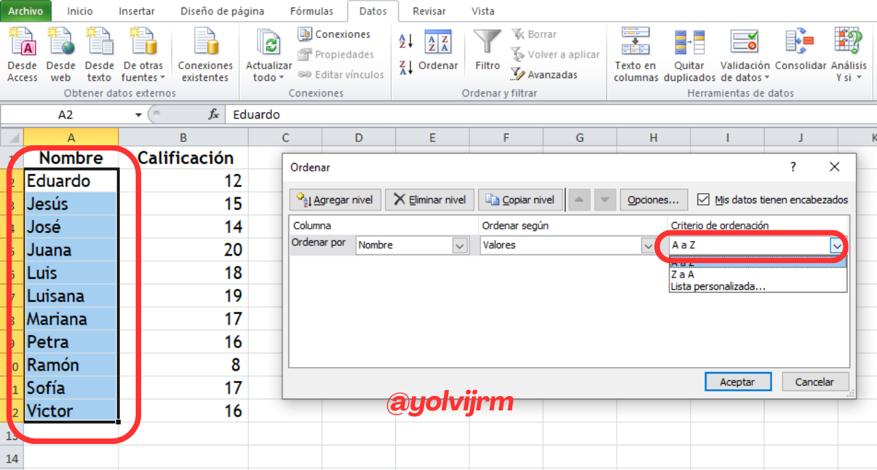 Para efectos de este ejercicio se orderaron los datos de forma alfabética; para ello se selecciona la opción A a Z, lo cual al darle click en acpetar, ordenará los datos alfabéticamente.