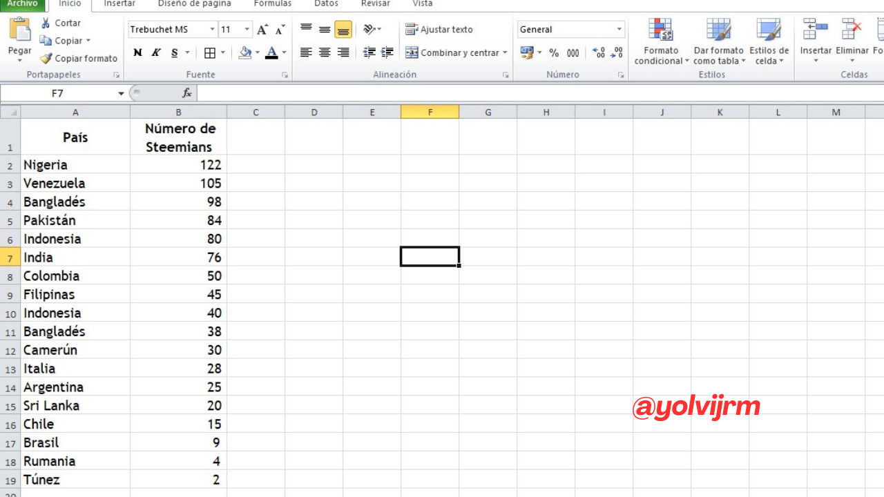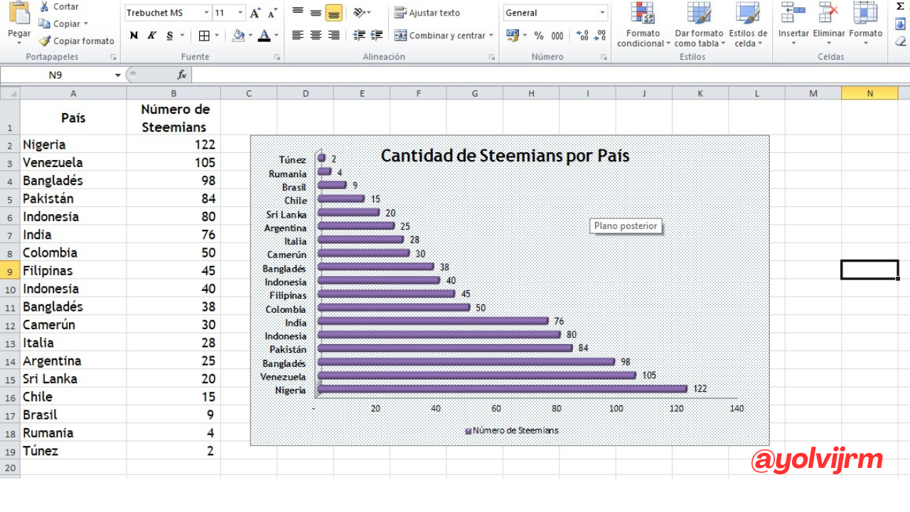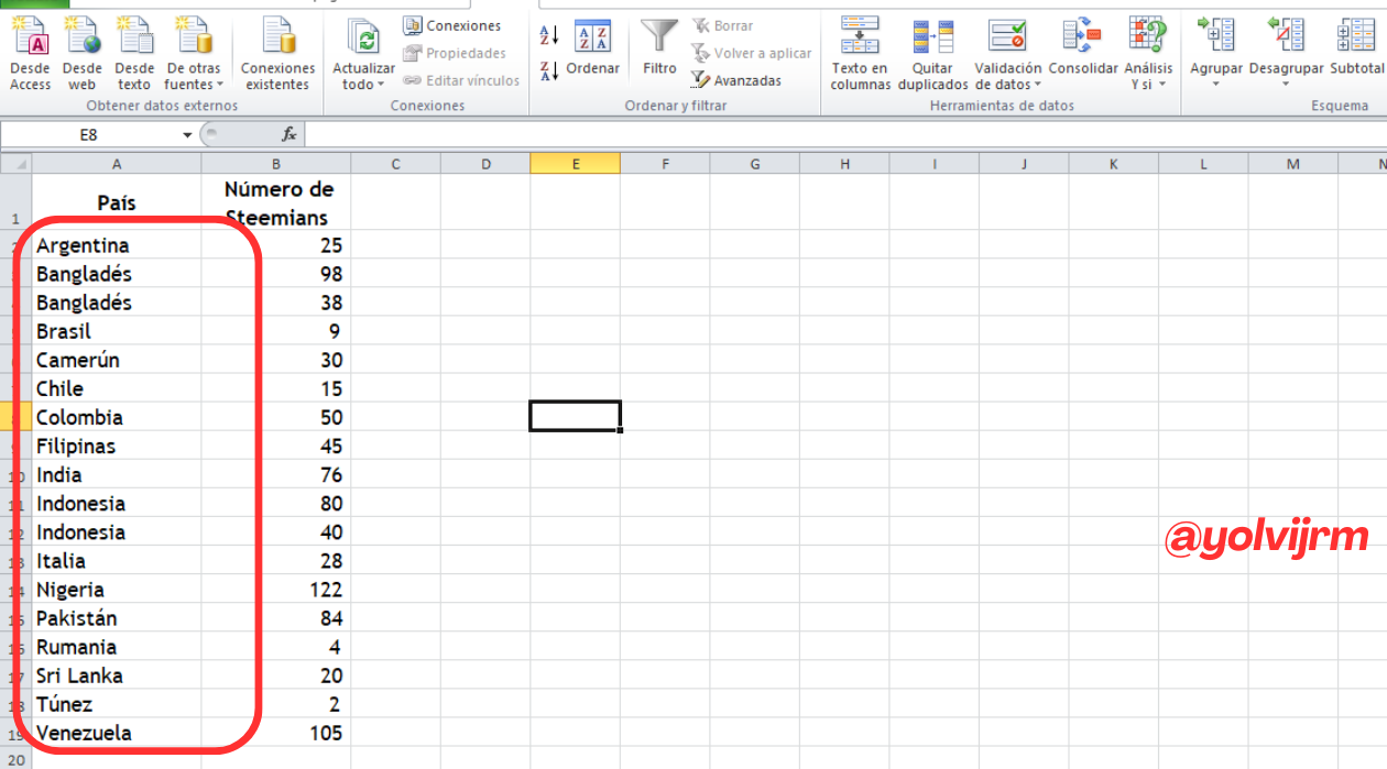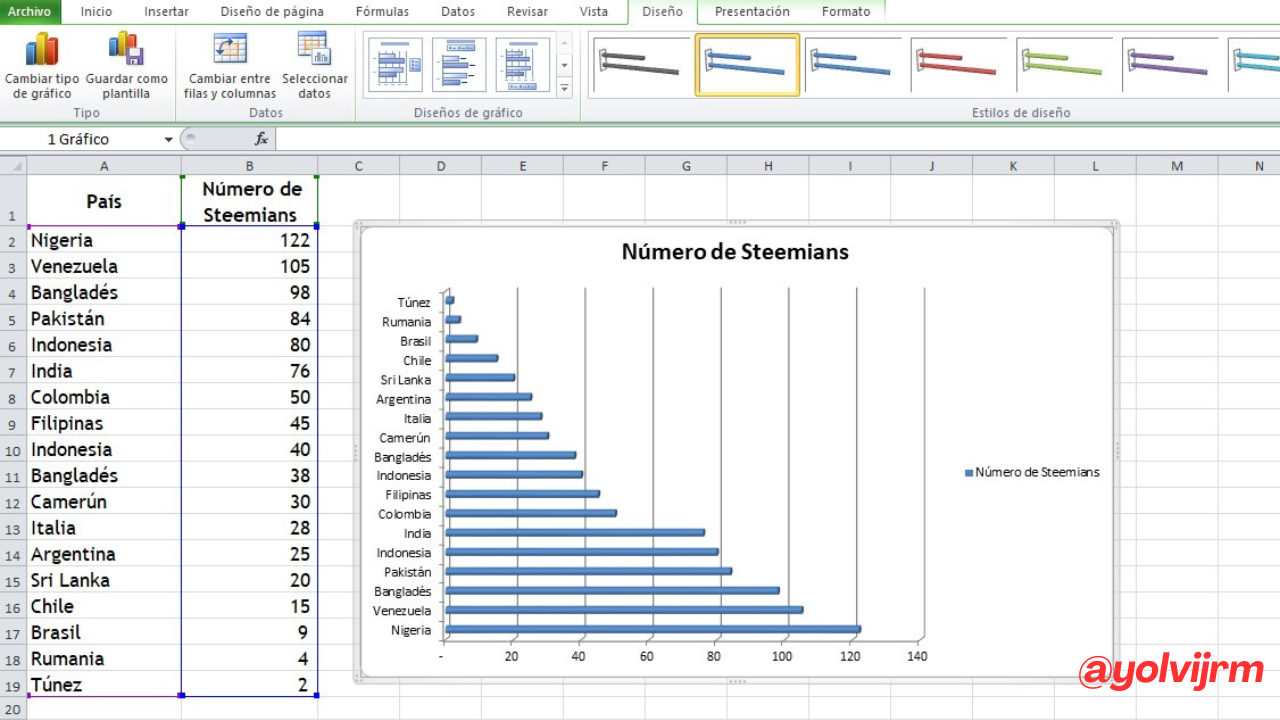 Luego de que se haya seleccioado el modelo de gráfico que se adapte a neustras necesidades, l seleccionamos y de forma automática se nos arrejará el gráfico, donde se sintetizan los datos que hemos suministardo. En este caso elegí el modelo 4, puesto que nos permitira visualizar de forma sencilla la distribución de Steemian según el país de origen.
