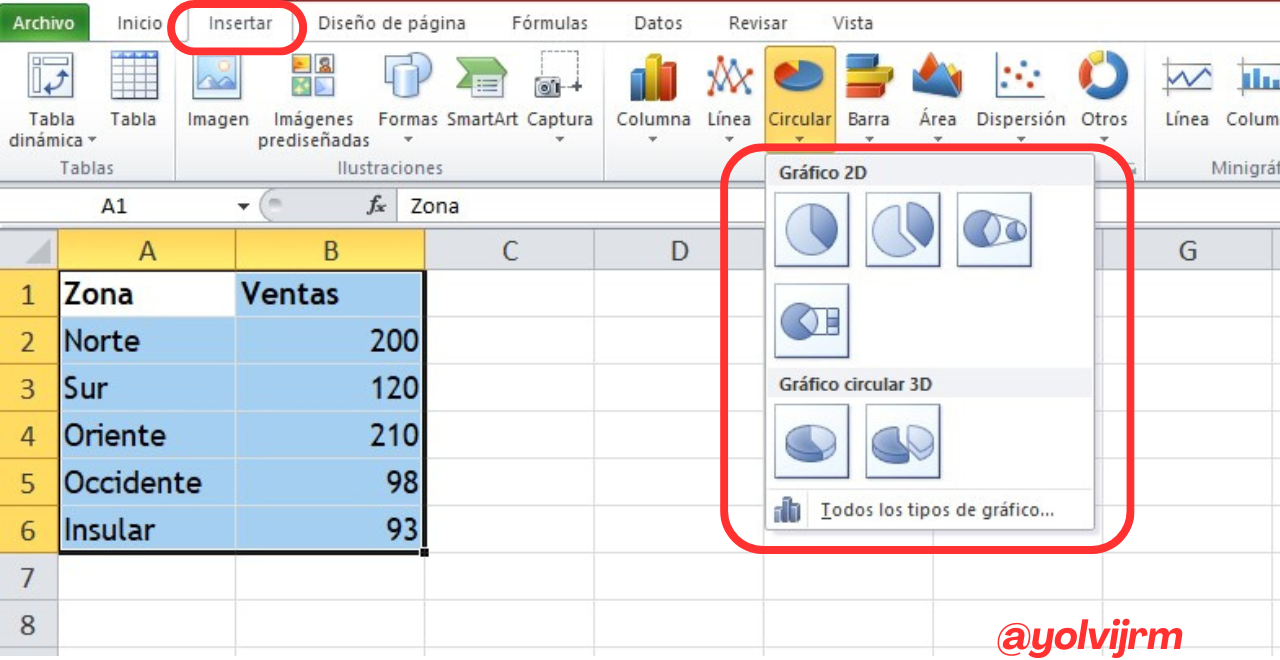 Para hacer uso de los gráficos circulares en Excel, luego de tener los datos que se quieren representar. Seleccionamos dichos datos, y luego la barra superior sección "Insertar", para posteriormente presionar la opción Gráfico Circular y se nos desplegará todas las opciones que tenemos en esta categoría.