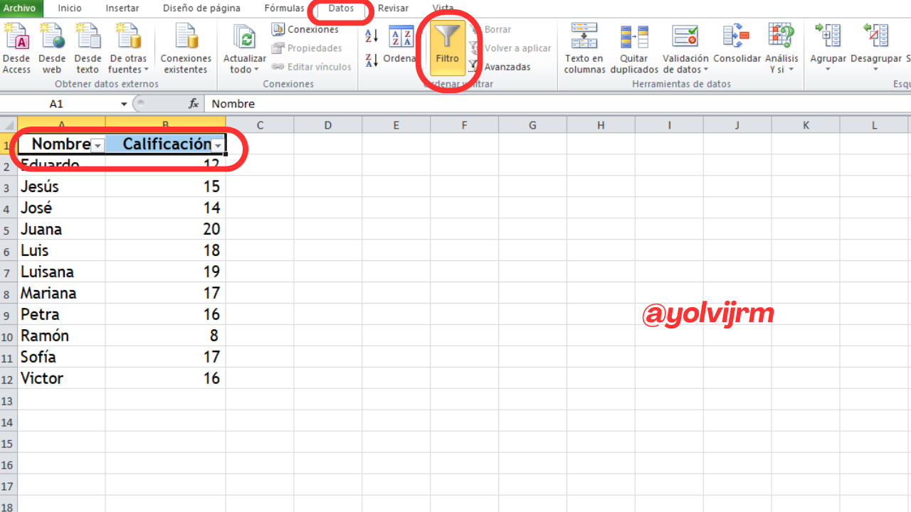 Ahora, por otra parte, para realizar el filtrado de los datos, en esta misma sección Datos, se hallará dl ícono de Filtrar, ahaciendo click en ello, se mostrará el símbolo del filtrado en las celdas que corrresponden al encabezado.