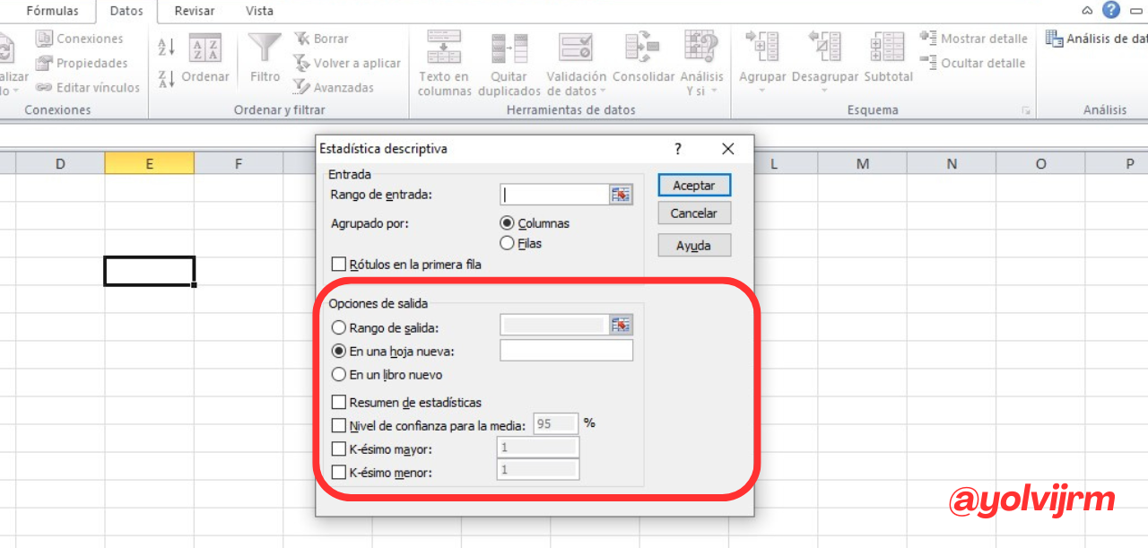 Al seleccionar Estadística Descriptiva, se desplegará una nueva ventana donde tendremos múltiples opciones para configurar según convenga, esta herramienta.