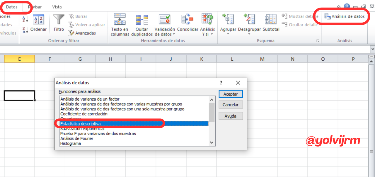 En la hoja de calculo de Excel, se puede ubicar la sección de Análisis Descriptivo, seleccionando en lla pestaña de Datos, el cual se ubicará ícono de análisis de datos; haciendo click en ello, se nos desplegará una ventana en la que debemos elegir la opción Estadística Descriptiva.