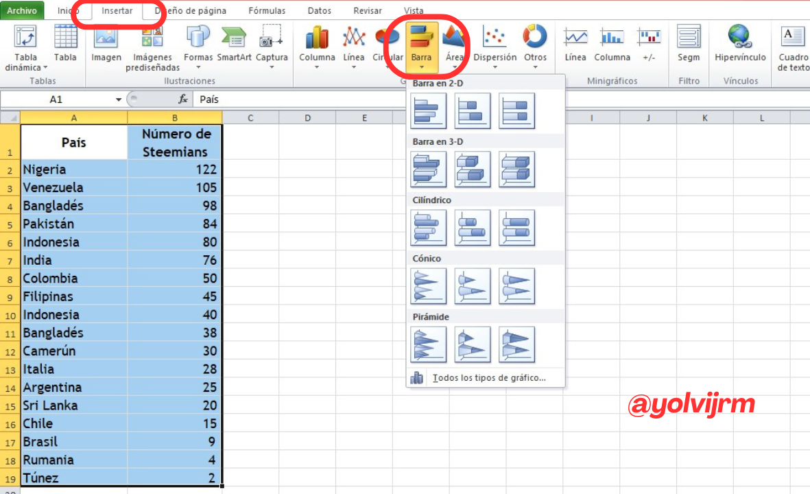 Una vez se tengan todis lis datos, se deben seleccionar y en la barra superior, sección "Insertar* se hace click en la Gráfico de Barras, con lo cual se desplegarán todas las opciones de esta categoría.