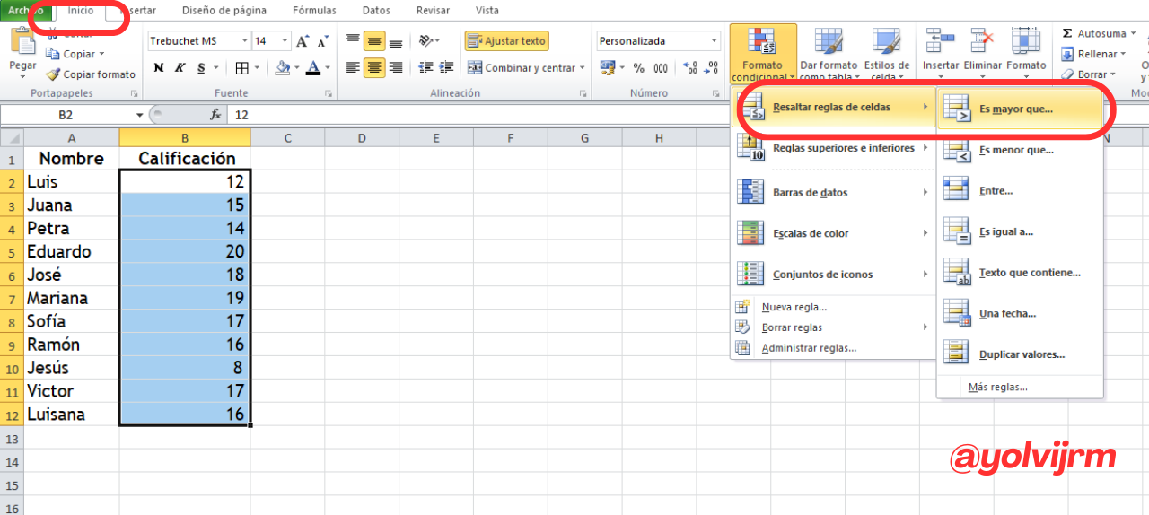 En esta oportunidad con una serie de datos correspondientes a las calificaciones de un grupos de estudiantes en una determinada asignatura se procedió a aplicar este formato condicional; en este caso el mayor que.