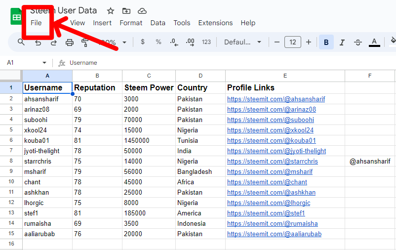 First of all, I want to inform you that I could not participate in the lesson four due to my personal issues. Because of this, I have created a self-file file which I have prepared on Google Sheets. The file which you can see below and above this file a file option is visible first we have to choose it.