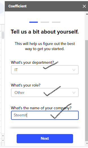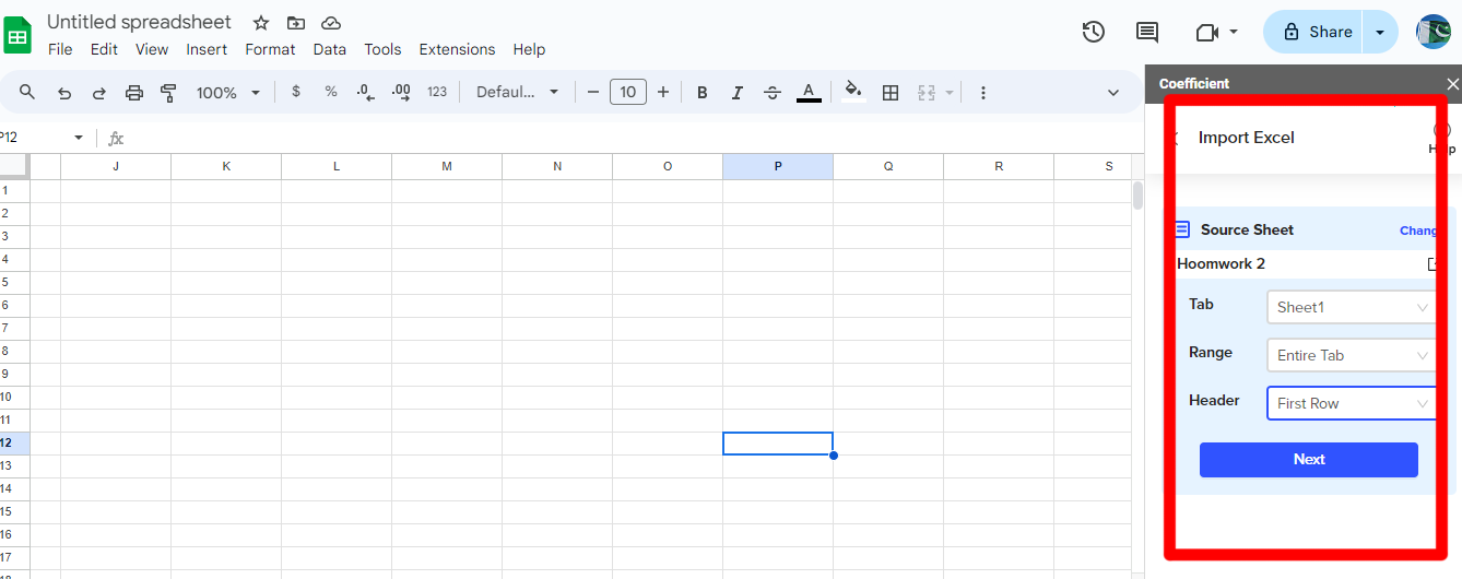 When our extension is installed, some contexts will open on the right side of our Google Sheet. Which we have to solve accordingly and then we have to proceed further by clicking on our next button.