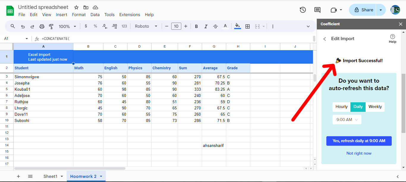 With this method, we can easily import any of our files on top of our Google Sheets. As you can see we got a successful import message because our lesson two has been uploaded here.