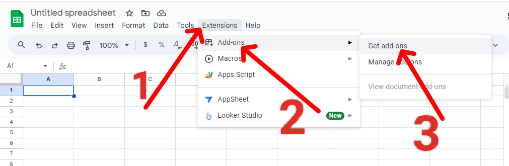 First, we need to open Google Shoot to import our data. After opening the Google Sheet we have to click on the Extensions button. When we move our cursor over it, more options will open up. Among them, we have to choose Add-ons. As soon as we choose it, two more options will open in front of it, the first of which we have to choose is Get add-ons.