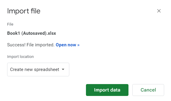 Now we have to Import the file. And we will fine our file that we want to import. then we will upload our file throiugh drive. then we will click on the Import. After that it will show us message successful. That our file successfully import. now we will click on the option open now. then it will open our fine into our Google Sheet
