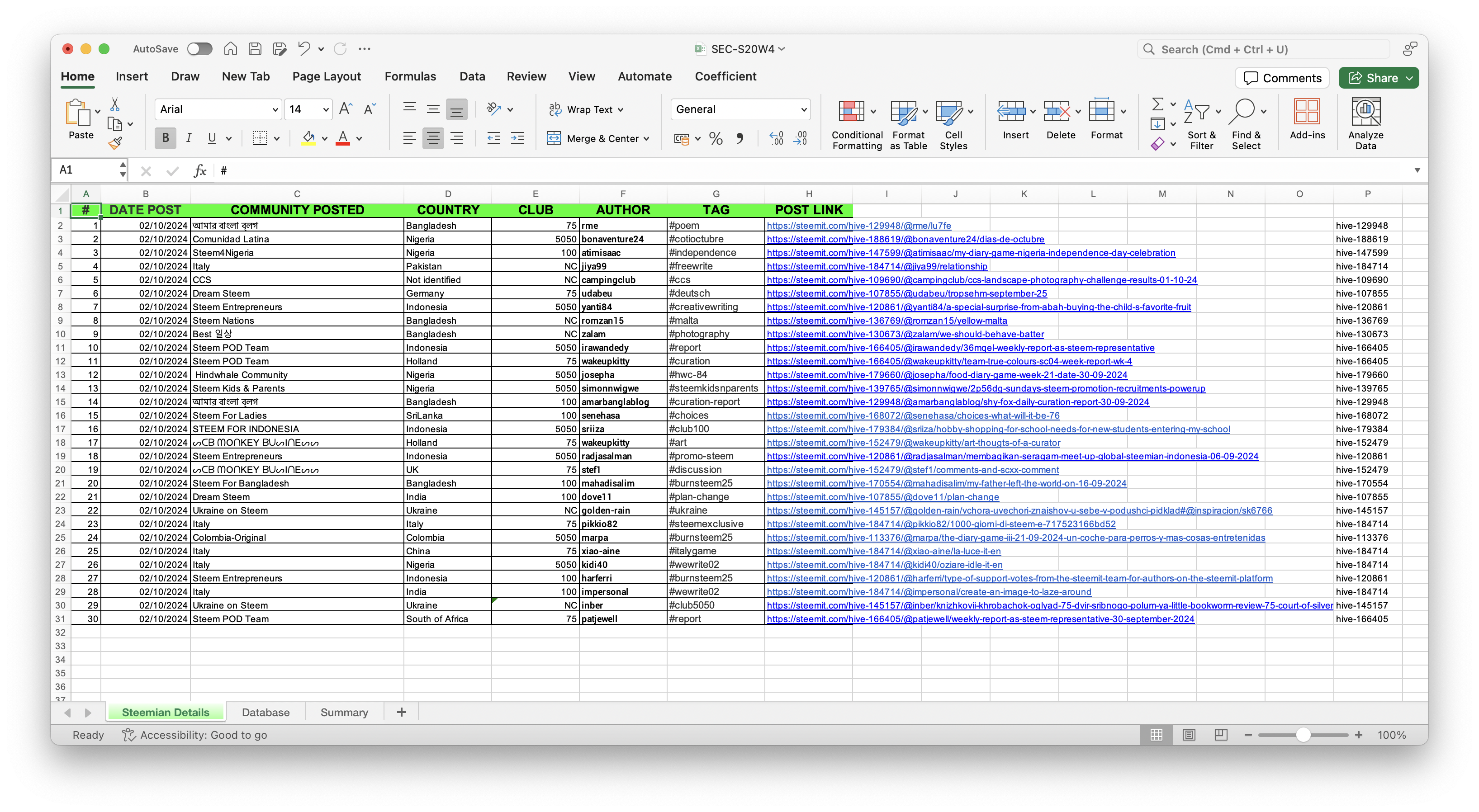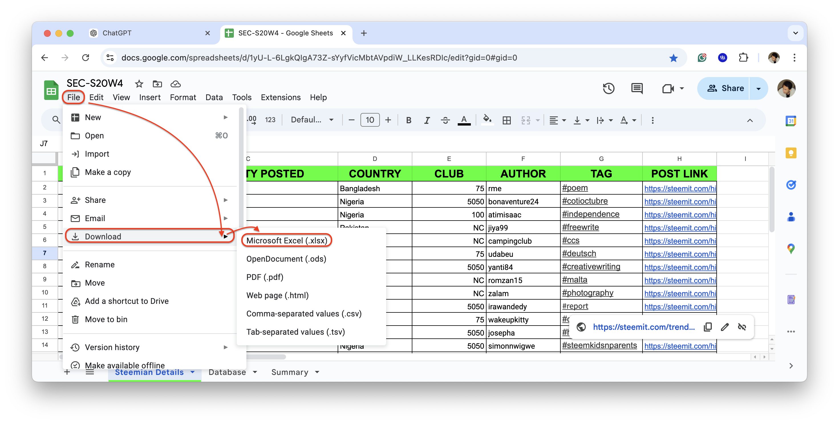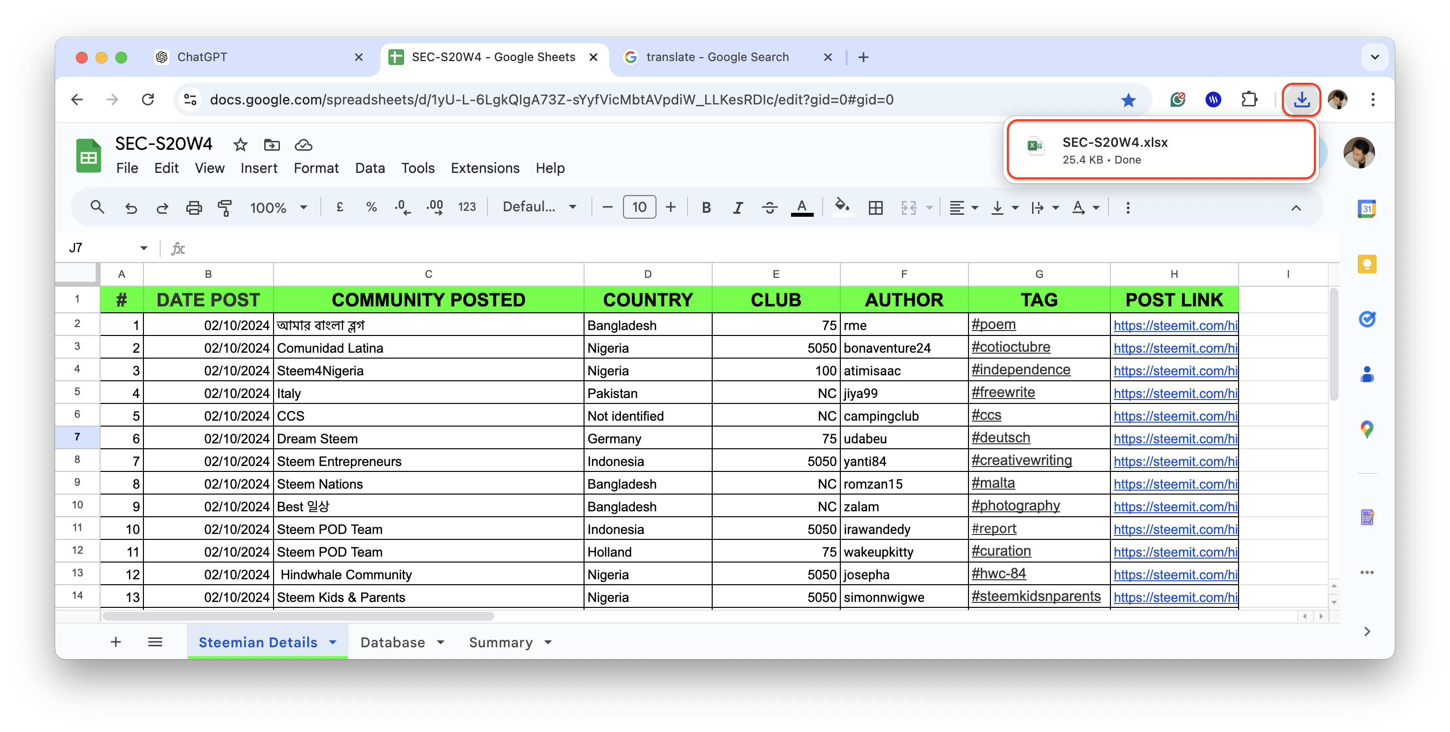 The image above shows the google sheet on last week's learning that has been downloaded in xlsx format. The image shows that there are 3 sheets (steemian detail, Data Base and Summary).