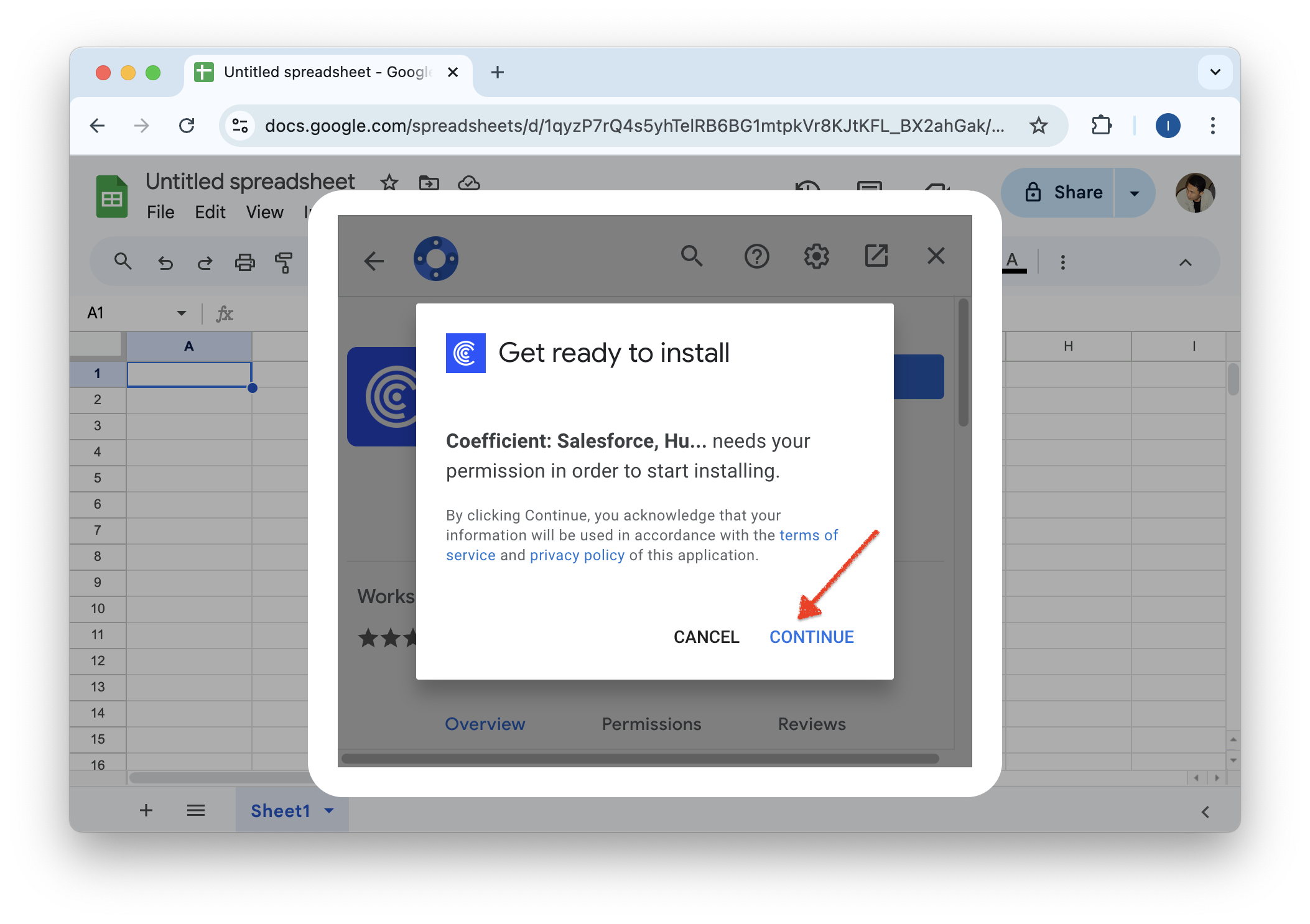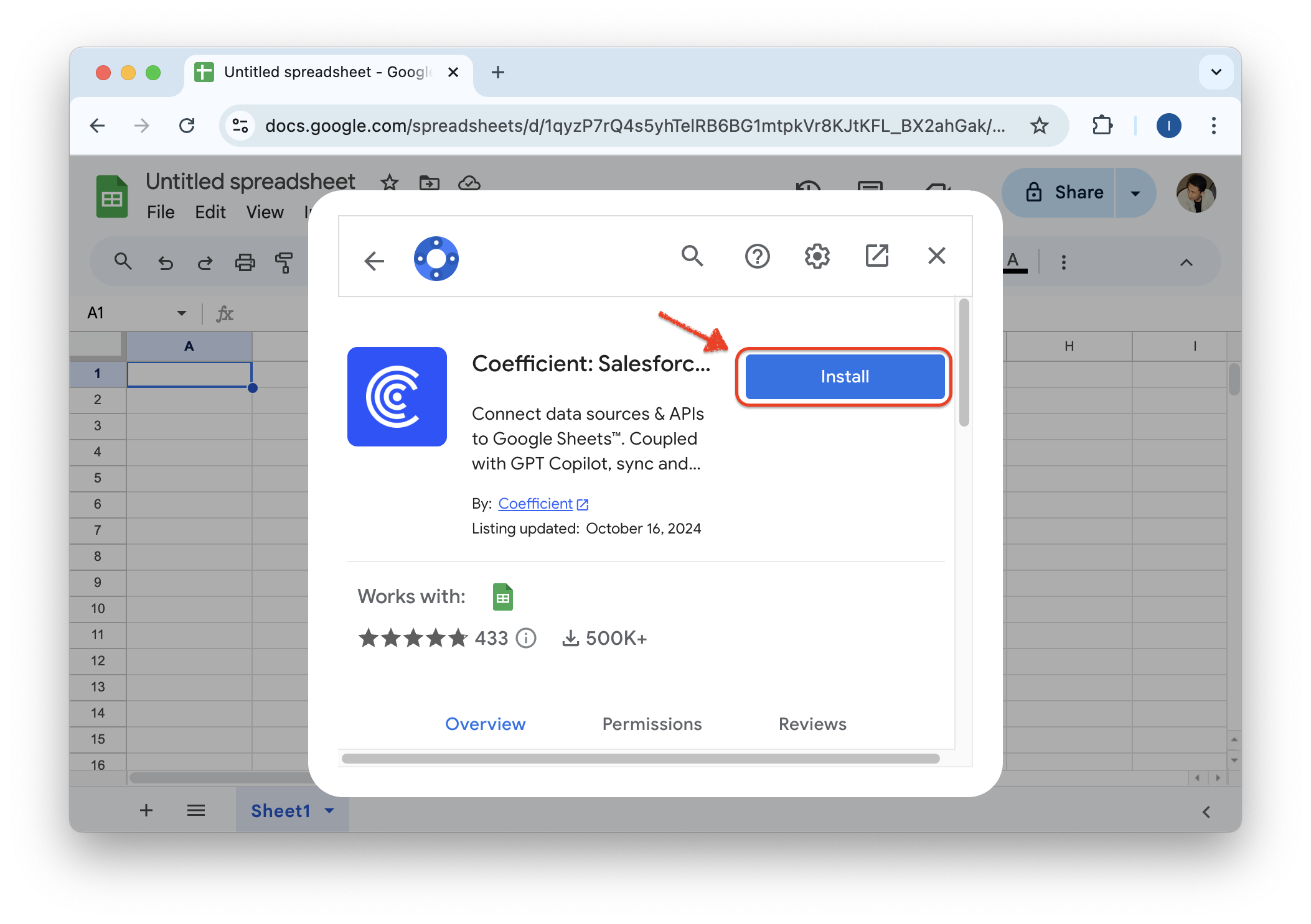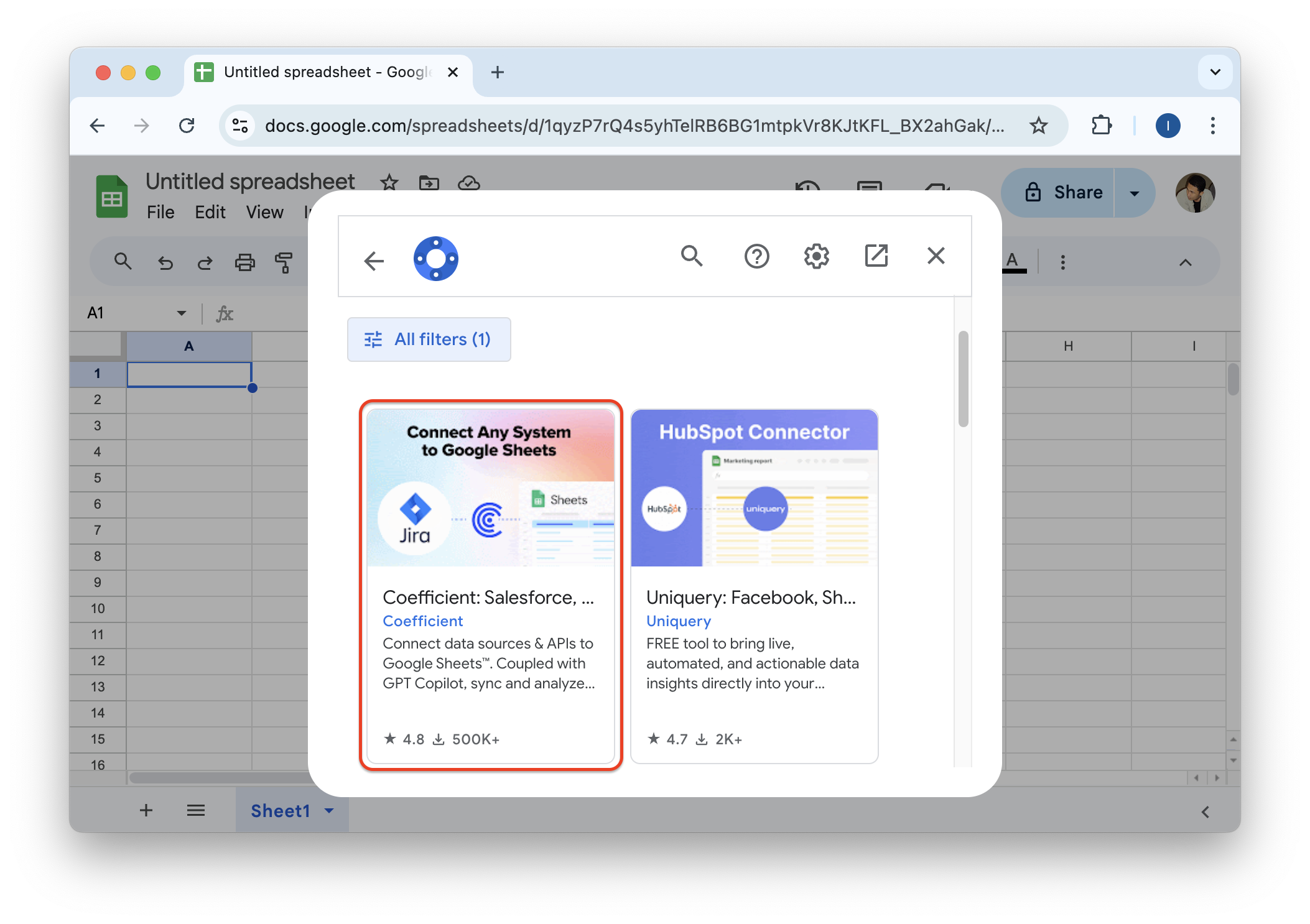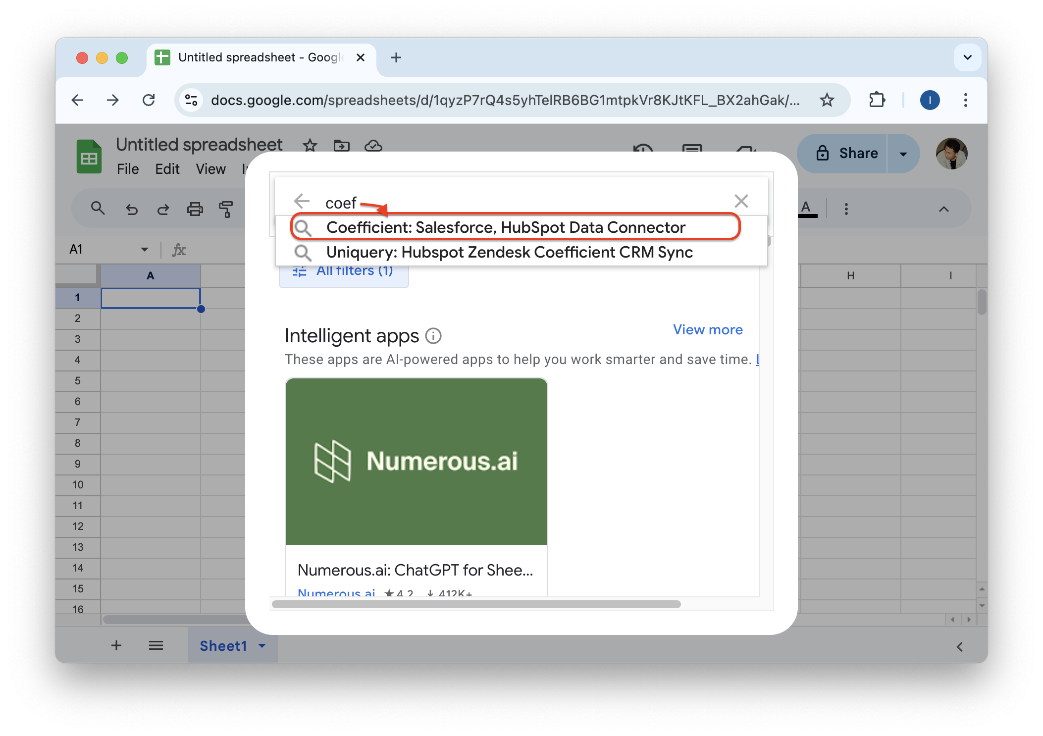 type Coefficient in the available search column, we will find an application that will be integrated with Google Sheets. Select Coefficient: Salesforce, HubSpot Data Connector as in the image above.