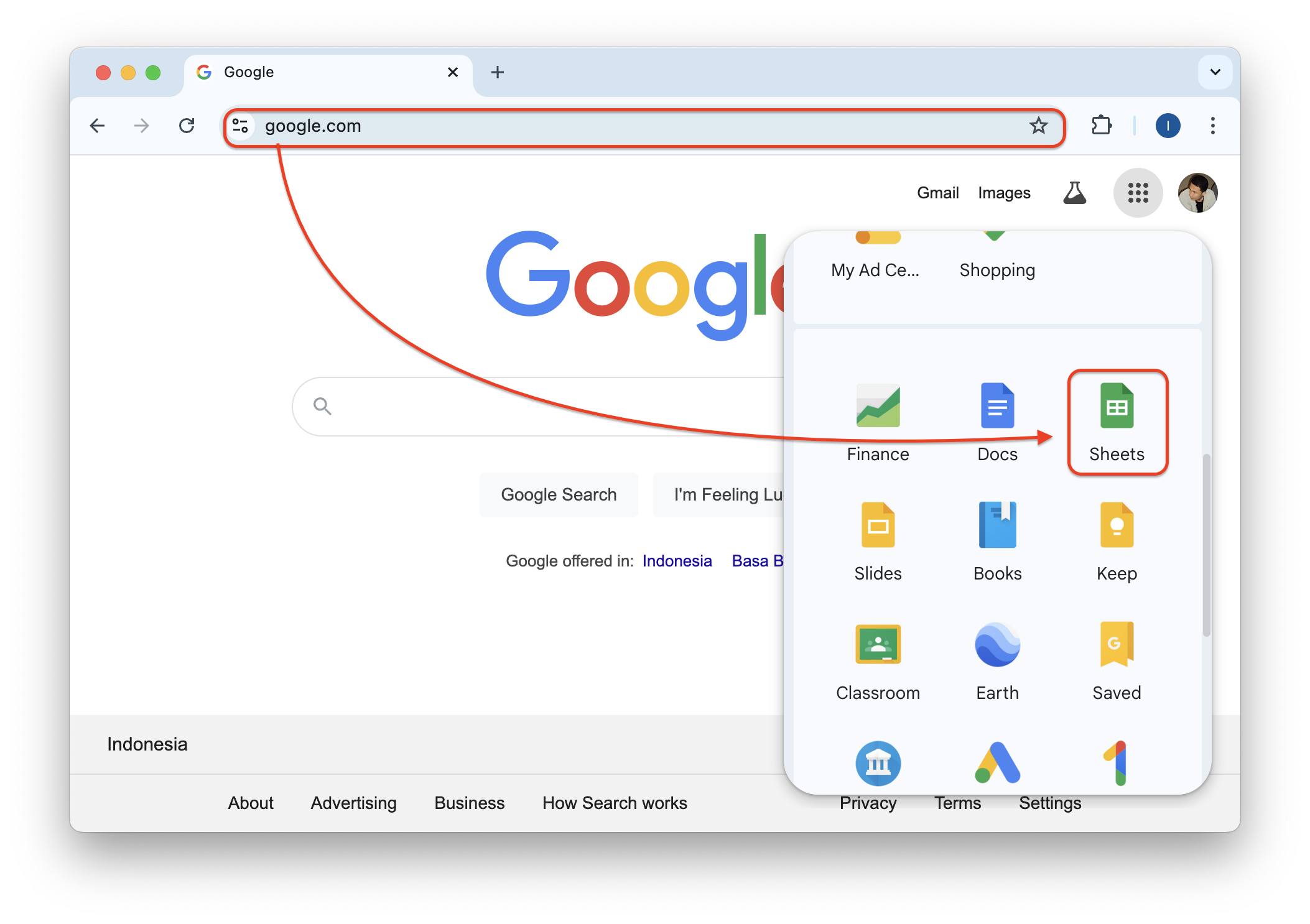 Since this system is online-based, to open the spreadsheet page, the first step that must be taken is to ensure that the device is connected to the internet network. Open a browser (I use Google Chrome) and type google.com in the address bar of the browser you are using, press enter and the Google page will appear, click Google Apps located on the left side of the user's profile picture, select the sheet. (note the picture on the left).