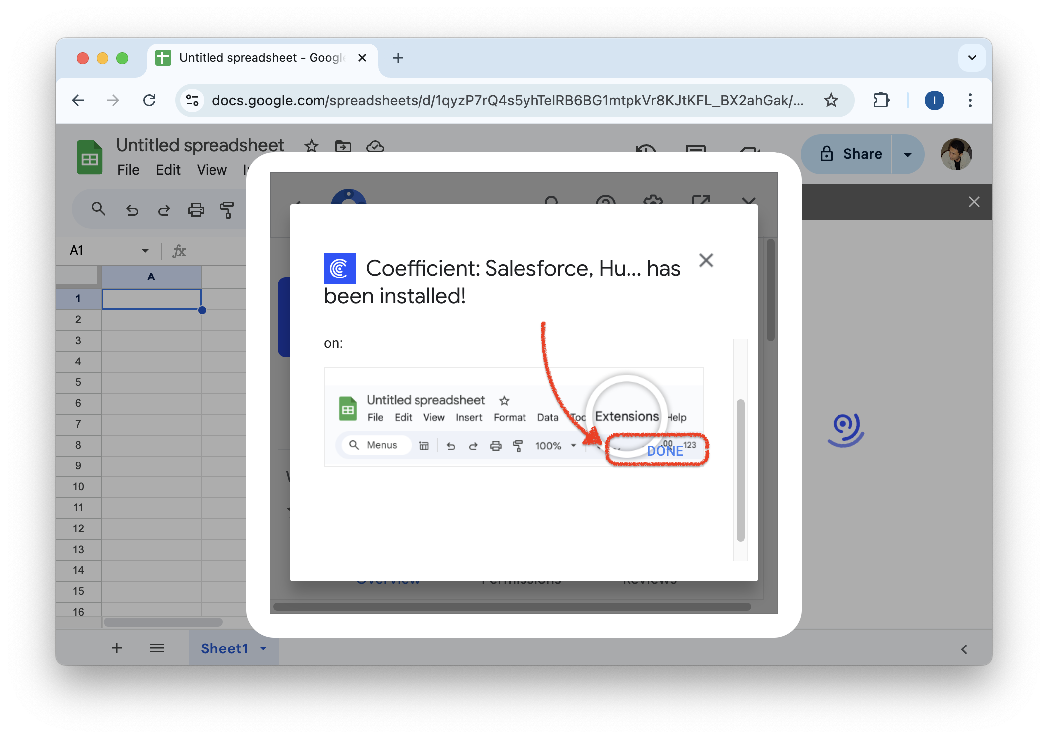 Well, now Extensions Coeficient has been installed on the spreadsheet page and end the installation stage by pressing done.