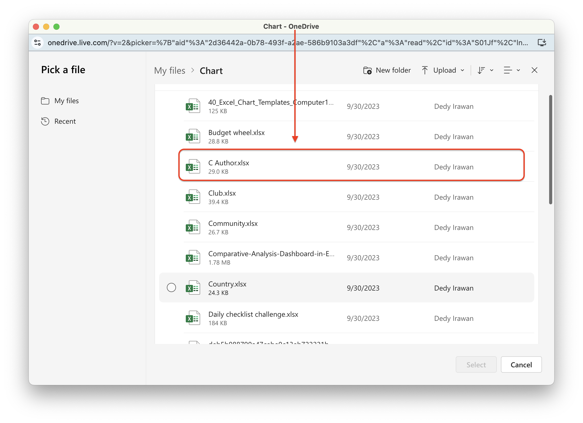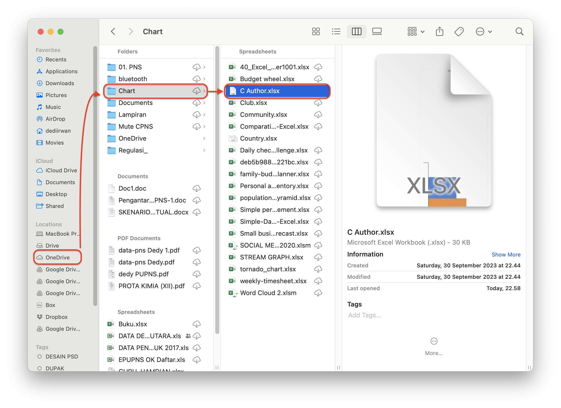 I have completed the login and am currently connected to my cloud one drive, then in the image on the right I will show the file to be imported, because I did not follow the 2nd learning process with the topic Data Analysis with Google Sheets: (Advanced Excel Formulas, and Pivot Tables), I chose to use another personal file that I named C. Author, as seen in the image above on the right.