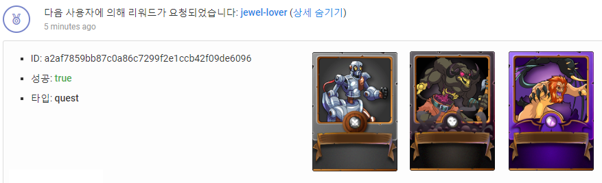 일일퀘스트jewel-lover (66)in #spt • 7 years ago 오랜만에 일일 퀘스트 글을 올리네요. water splinter로 5번 만에 끝냈네요. 이렇게 한번에 끝낸 경우는 처음인 듯 하네요. reward 결과도 좋네요. #iv #steemace #palnet #zzan #battle #sportstalk #liv #marlians