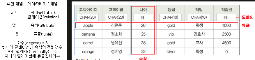 ** 스키마 : 데이타베이스에 저장되는 데이터 구조와 제약조건을 정의한것 ==> 릴레이션, 테이블, 개체(Entity) >> 엑셀의 시트와 비슷한 개념