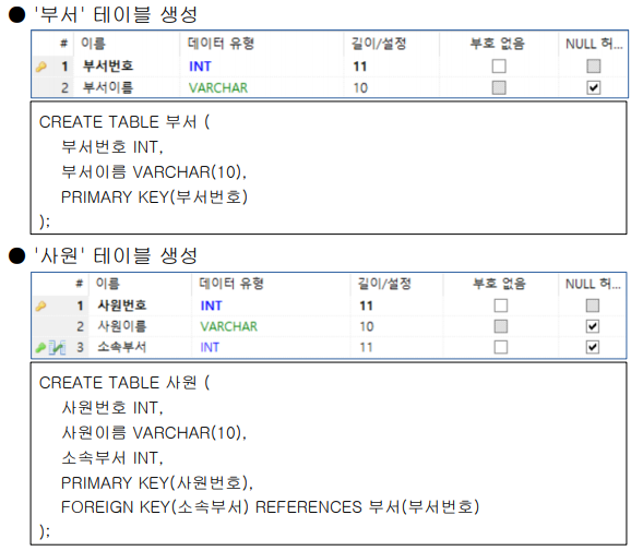 REFERENCES : 참조하는 테이블과 속성을 지정 ==> ex) FOREIGN KEY (소속부서) REFERENCES 부서 (부서번호)