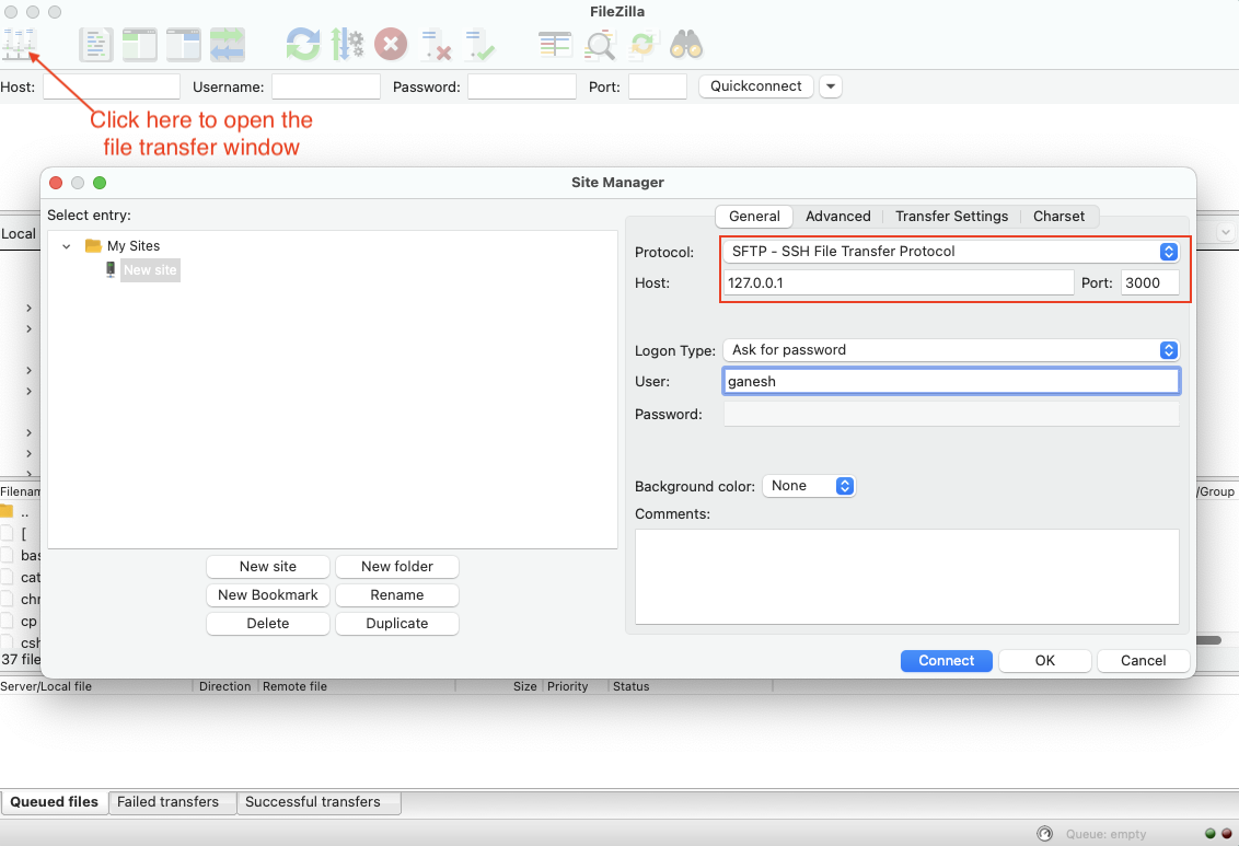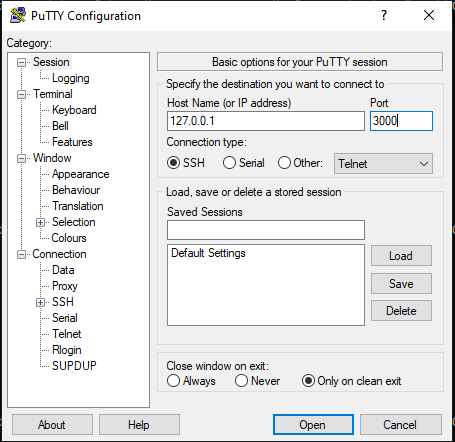 In this window, you'll see that we've entered the localhost IP 127.0.0.1 and adjusted the SFTP port from 22 to 3000.