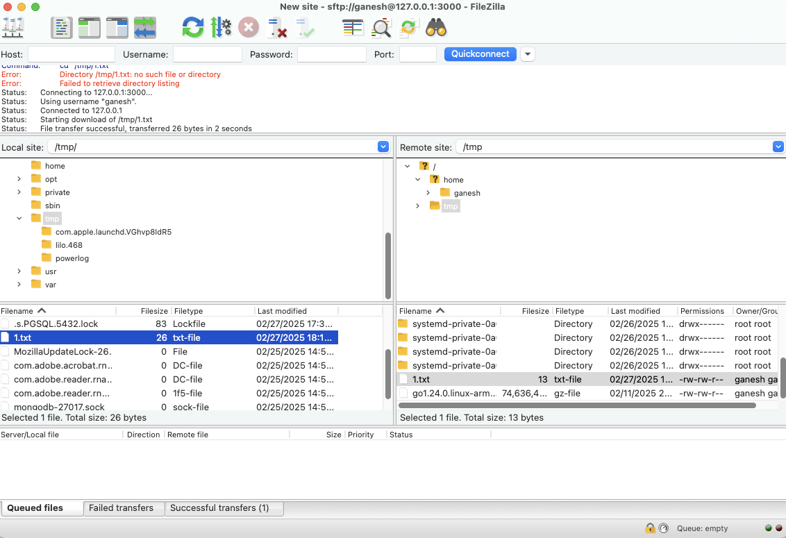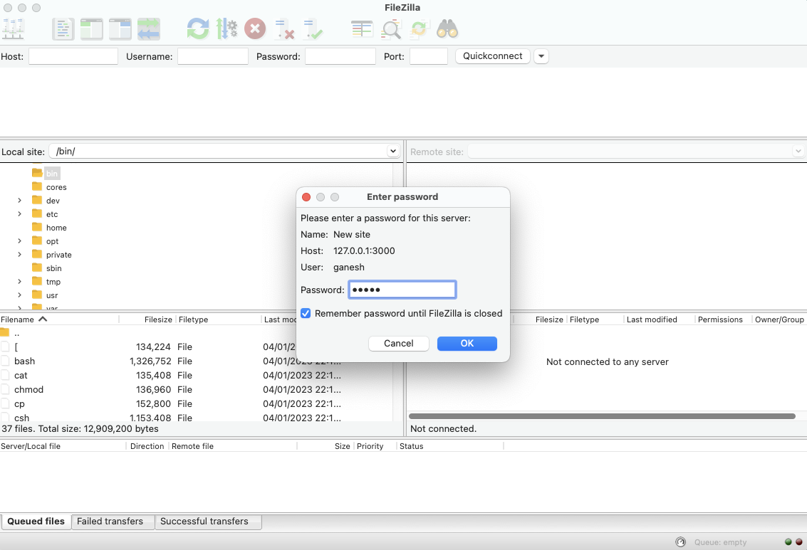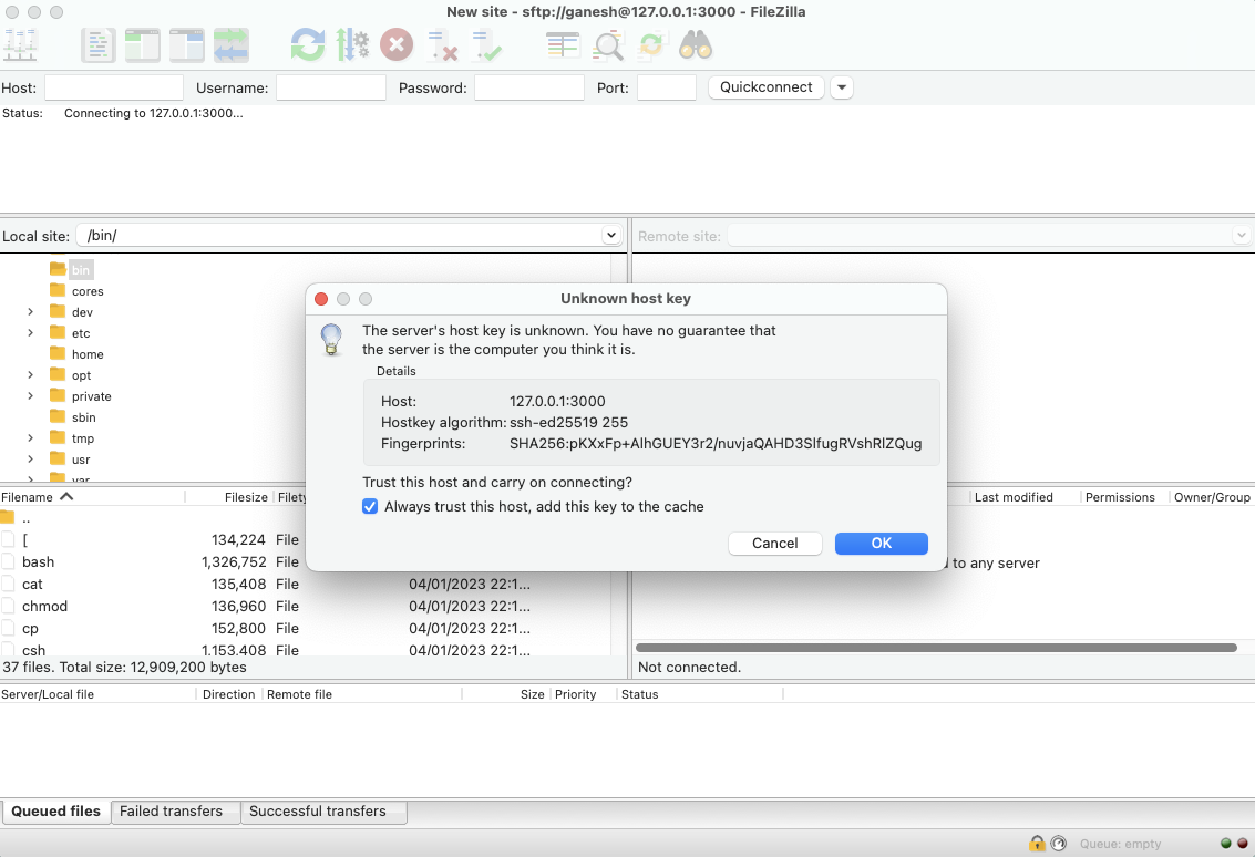 Utilize Filezilla to securely transfer files between a local machine and remote device, using SFTP and SocketXP's local-proxy server. The server listens on local IP 127.0.0.1 and local TCP port 3000.