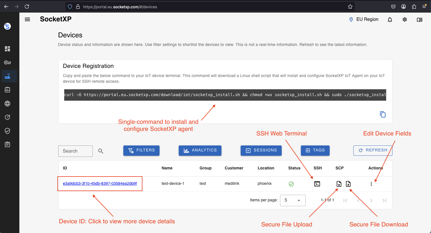 You shall find the device ID of your IoT device (--peer-device-id) from the SocketXP Web Portal’s Devices Page.