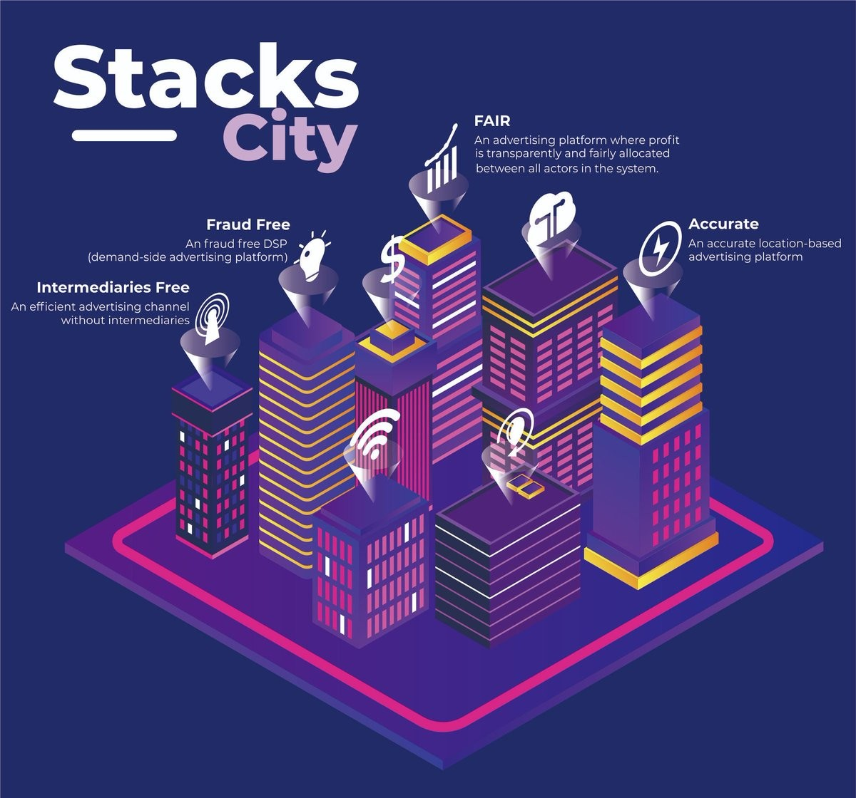 StacksCity è una piattaforma pubblicitaria decentralizzata in cui tutti gli attori del sistema vengono premiati per i loro contributi. massimizzando i vantaggi combinati della pubblicità basata sulla posizione; condivisione economica; e tecnologia blockchain. Collaborando con MATIC NETWORK. Uno degli obiettivi principali dell'utilizzo della blockchain come tecnologia di base è fornire servizi con fiducia agli utenti, inclusi proprietari di router, inserzionisti e utenti WiFi. Ogni volta che un utente WiFi visualizza un annuncio sulla pagina di accesso WiFi, il numero di visualizzazioni verrà aggiornato sulla blockchain e il token verrà distribuito al proprietario del router e all'account Stacks in base al prezzo e alla politica dell'offerta.