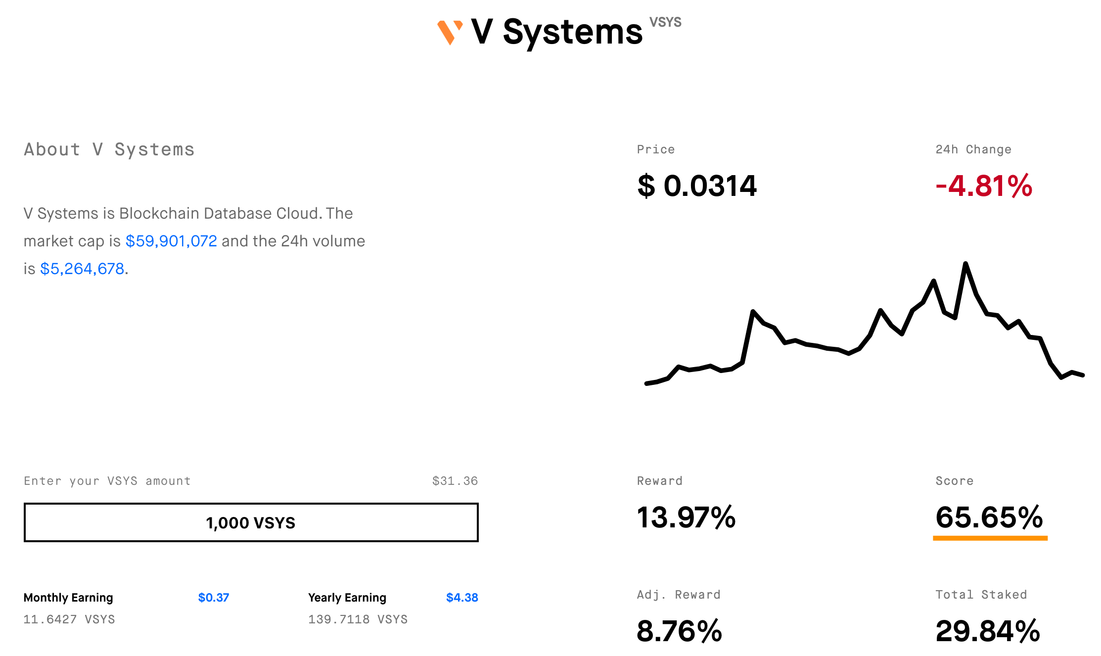 This week, VSYS has gained an overall StakingRewards Score of 65.65% on stakingrewards.com. V SYSTEMS promises to maintain a healthy staking environment for all token users. With VSYS coins, you can easily enjoy the rewards from staking with just a few clicks. Take action now!