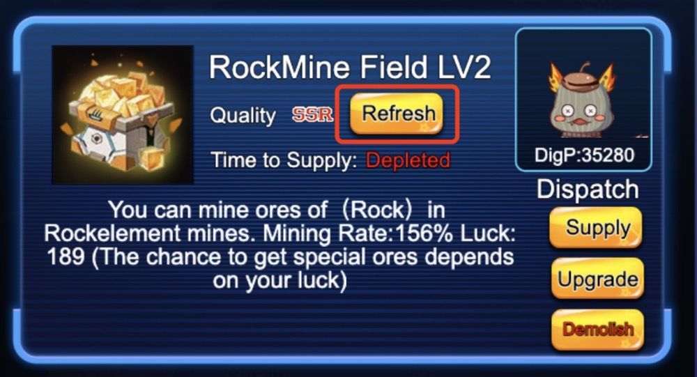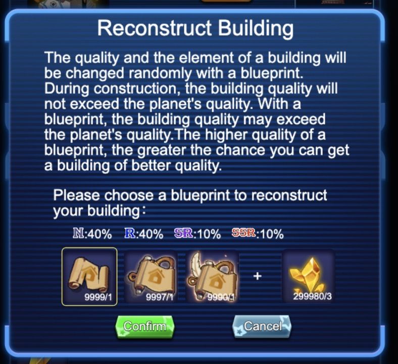 Click the confirm button to renew your building. The quality of the renewed building will be based on the percentage rate shown above. For example, the rate of getting an SSR building is 10% if you choose the first permit in the picture above. After being reconstructed, the luck and the mining rate of a minefield will be refreshed too.