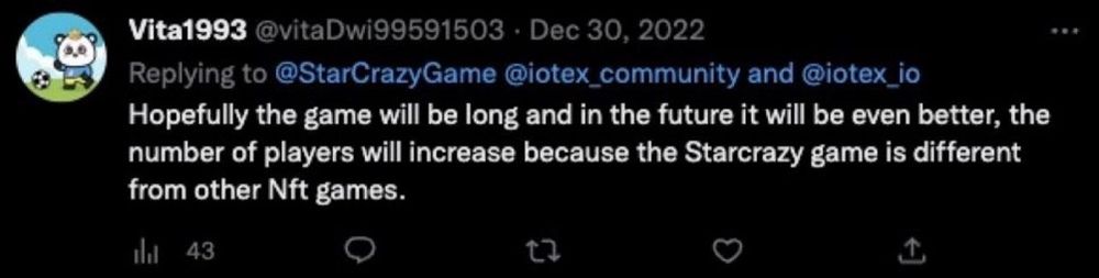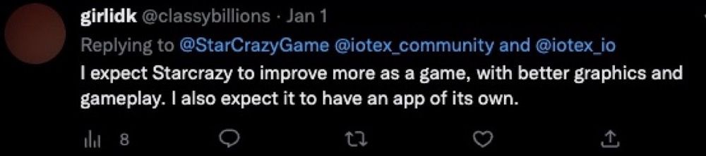 First of all, HAPPY NEW YEAR! We now enter a new year for Starcrazy. This year, you can expect more exciting events and attractive features added into the game. Last week, we held a WGFT giveaway on our official Twitter account for collecting inspiring and encouraging expectations for Starcrazy in 2023. As always, we love to hear different voices from our community. So let’s check out some of those thought-provoking ideas!