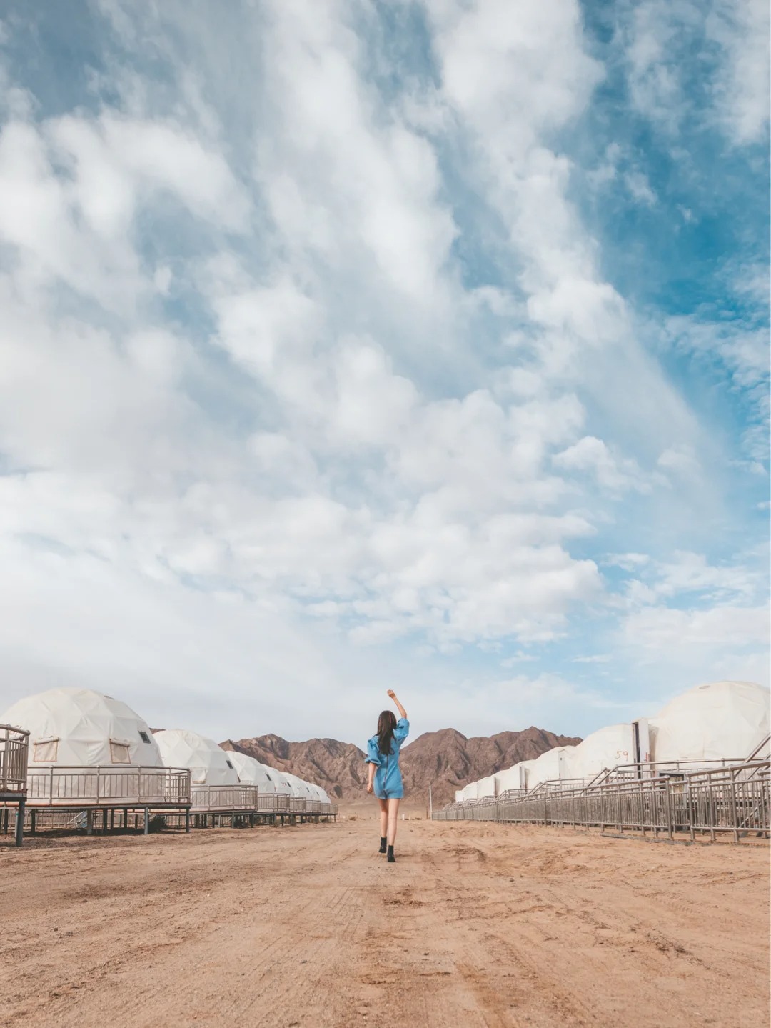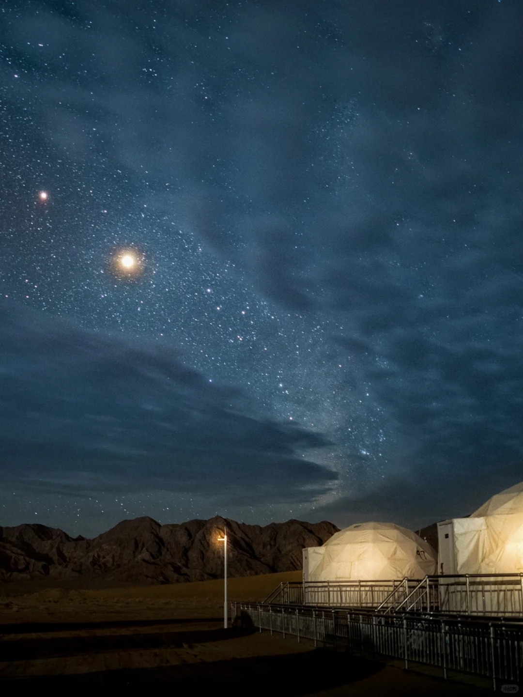 营地坐落于广袤的沙漠之中,背靠雄伟的雪山,夜幕降临时,繁星密布,银河仿佛触手可及,炫目的半圆形帐篷点缀其间,营造出一种辽阔而震撼的美景。这里因远离水汽与光污染,成为观赏银河的绝佳之地。我们到达的那天,天空阴云密布,原以为无缘见到银河,然而在深夜时分,银河依然破云而出,伴随着缥缈的云层,展现出一种更加梦幻的景象。