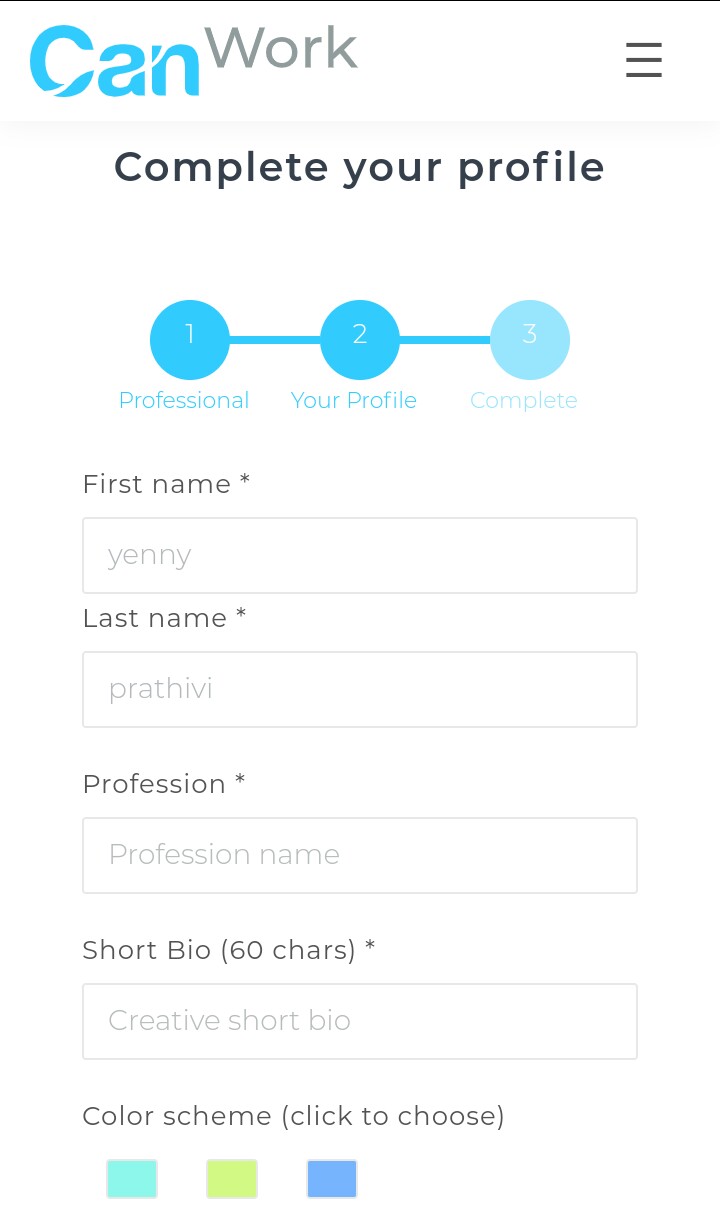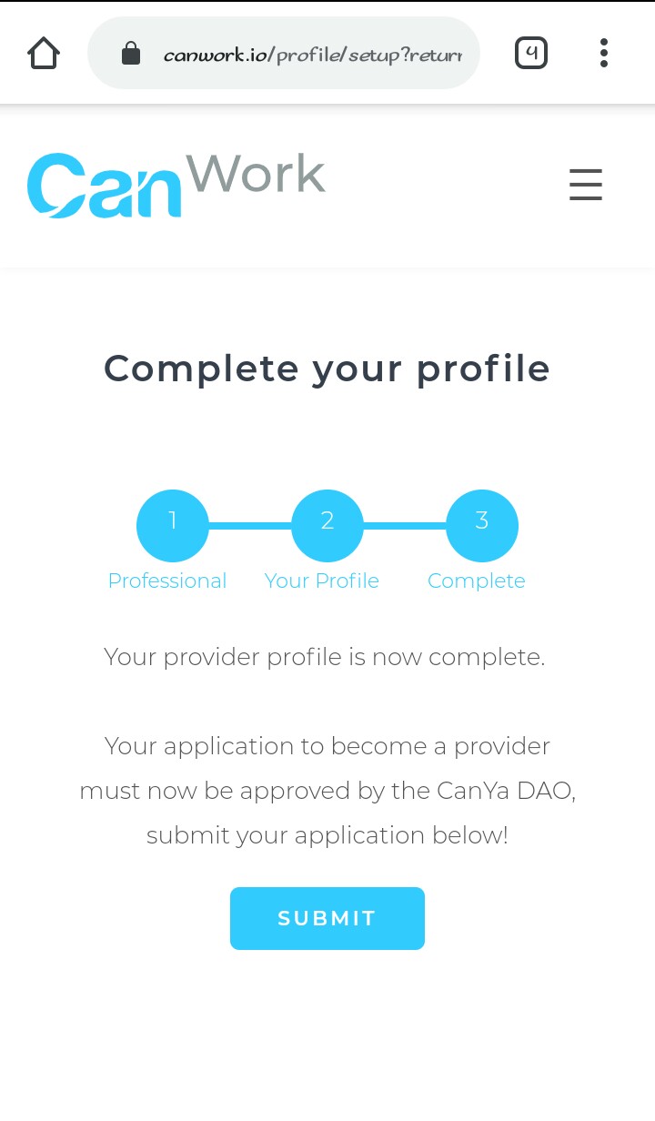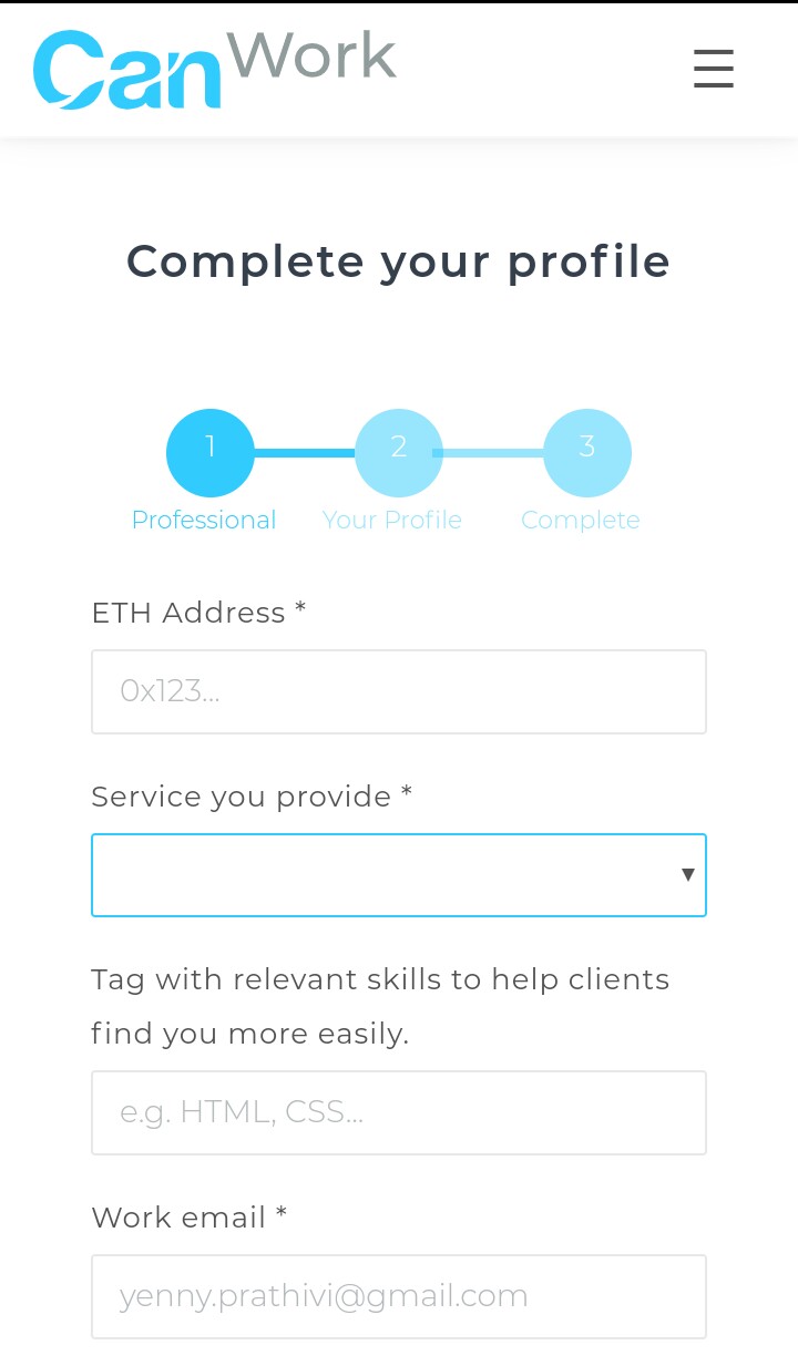 - Complete your profile: The complete your profile page contains different fields such as an Etherium address (where payment is made to), service one renders, tags related to your field, name, email, and dollar hourly rate a freelancer charges their client. By accepting to CanWork terms and conditions, your profile is then submitted to be approved by Canwork DAO.