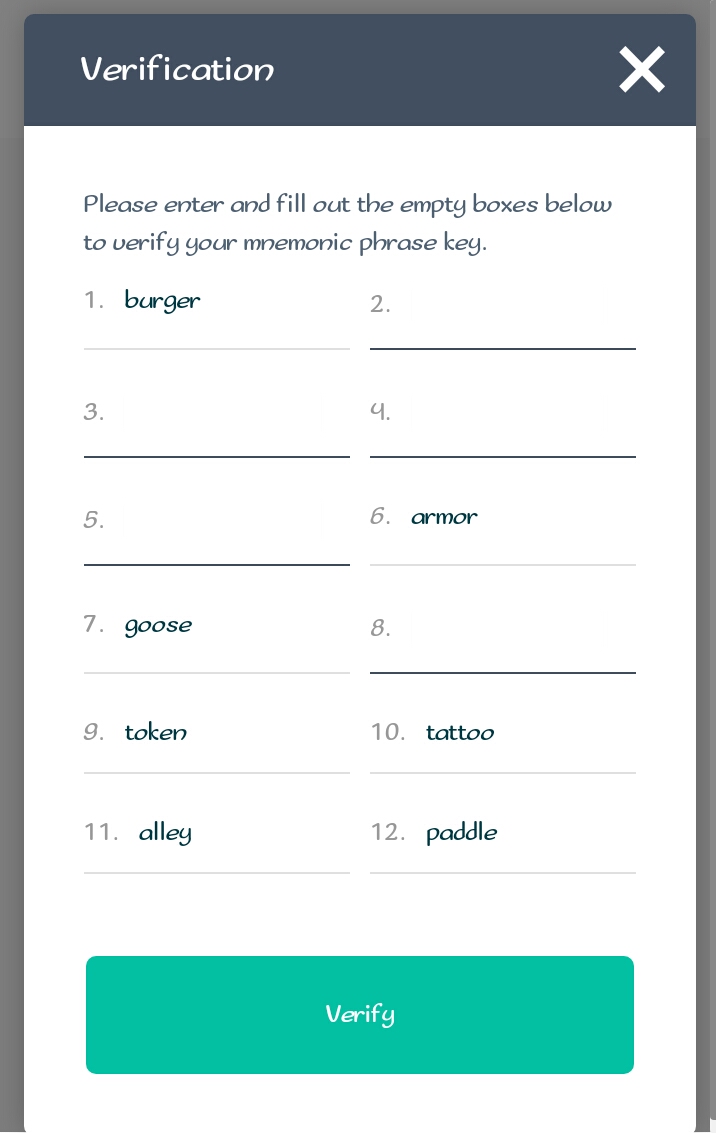 - After writing down the phrase, click to go to the next page where you will have to verify the written phrase.